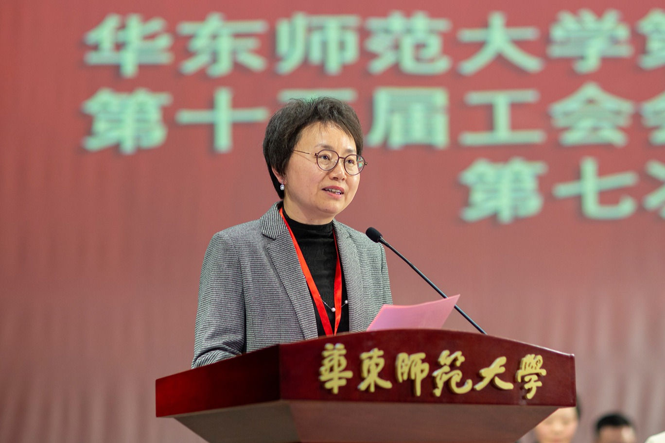 校党委常委、副校长、工会主席程静代表校第八届教代会执行委员会和第十四届工会委员会作了题为《不忘初心, 砥砺前行,为加快建设引领育人创新的中国特色世界一流大学汇聚磅礴力量》的工作报告