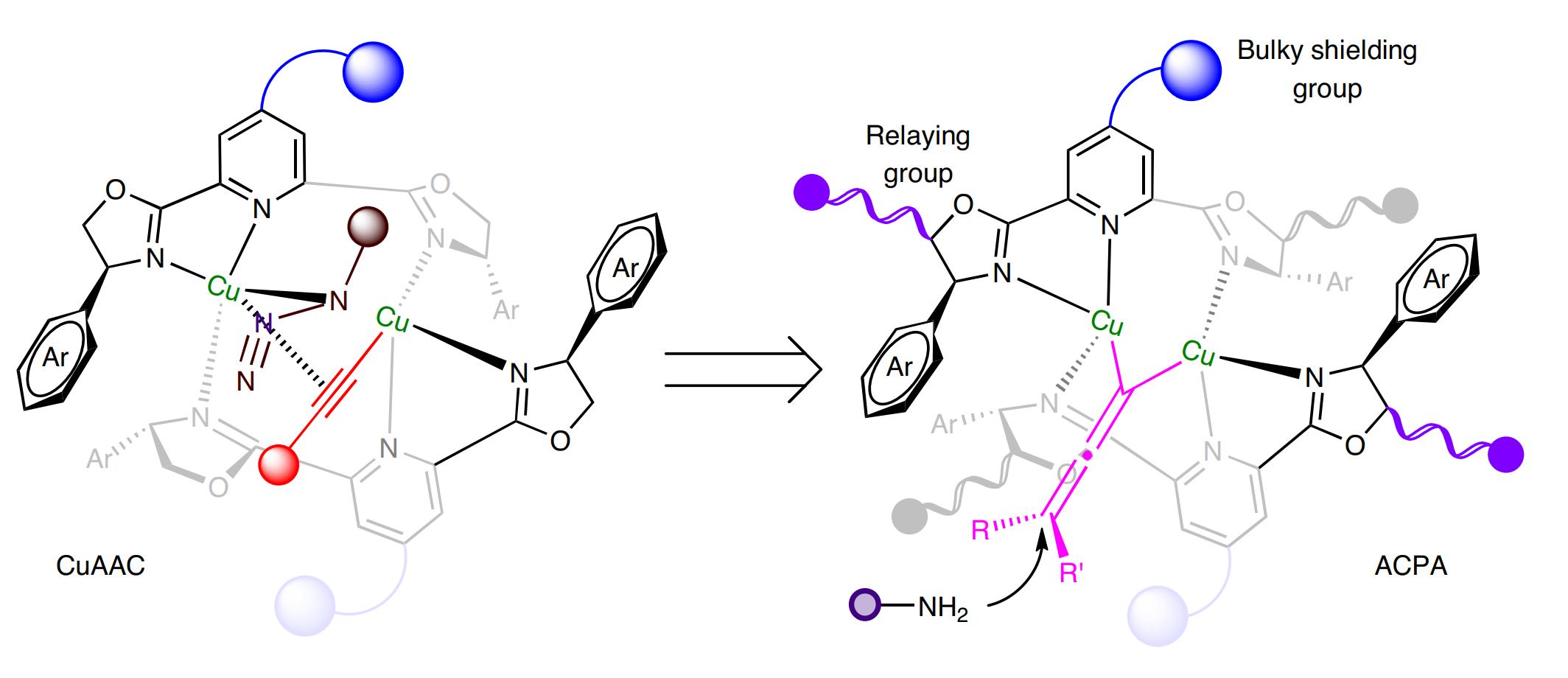 为了解决这一关键科学问题,周剑教授团队开展了持续研究。2009年,周锋从四川师范大学保送至周剑教授课题组攻读博士学位,研究课题就瞄准了去对称化反应中的远程手性控制难题,开展了高对映选择性的不对称铜催化叠氮和炔烃的环加成反应(CuAAC, 点击化学)研究。尽管2022年获诺贝尔化学奖的“点击化学”反应在当时已有广泛应用,但受限于远程手性控制的难题,没有成功的不对称催化例子报道。经过两年多的艰苦探索,周锋实现了首例高对映选择性的点击化学反应(J. Am. Chem. Soc. 2013‚ 135‚ 10994),并通过校内选拔留校担任讲师,继续针对这一难题开展研究。在过去十年,课题组发展了一系列在吡啶C4位引入大位阻功能基的吡啶双噁唑啉配体(PYBOX),在不对称点击化学反应领域取得了系列研究成果(Chem. Sci. 2020, 11, 97; Angew. Chem. Int. Ed. 2021, 60, 8488; Angew. Chem. Int. Ed. 2023, e202301470)。