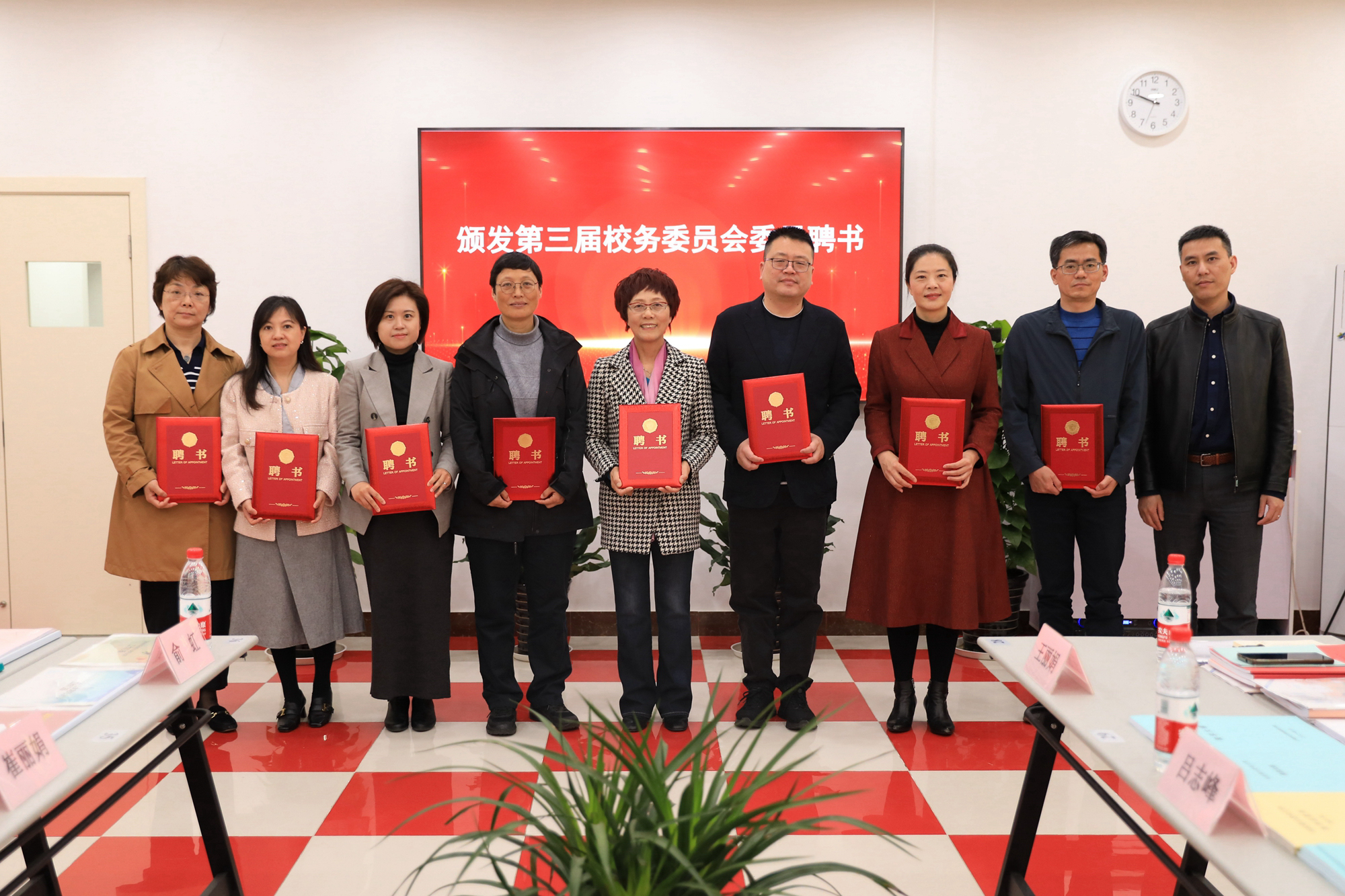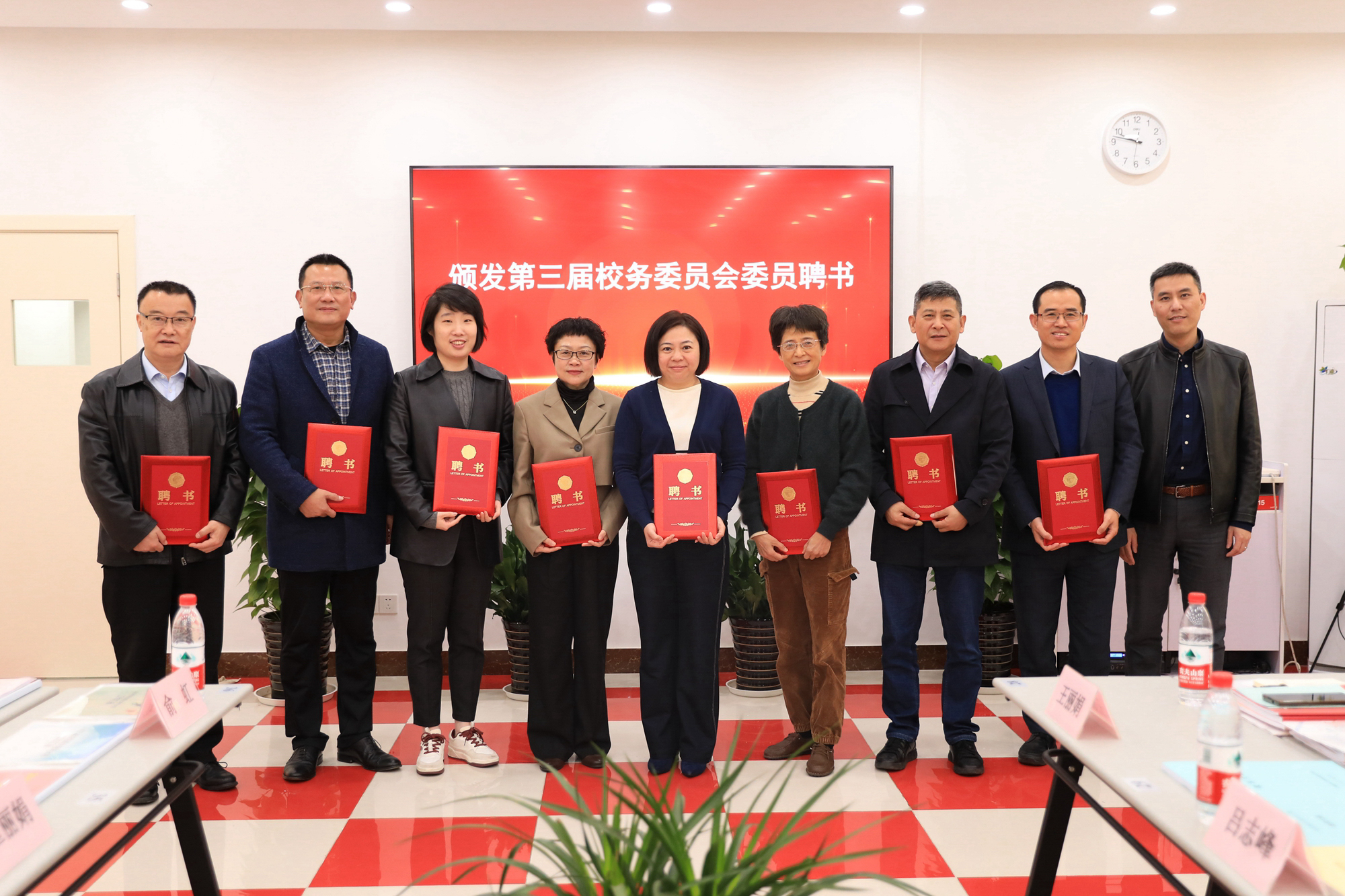 老龄办主任张军宣读了老年大学第三届校务委员会名单,委员会由来自22个职能部门及院系的共计24位成员组成。孟钟捷为第三届校务委员会委员颁发聘书。
