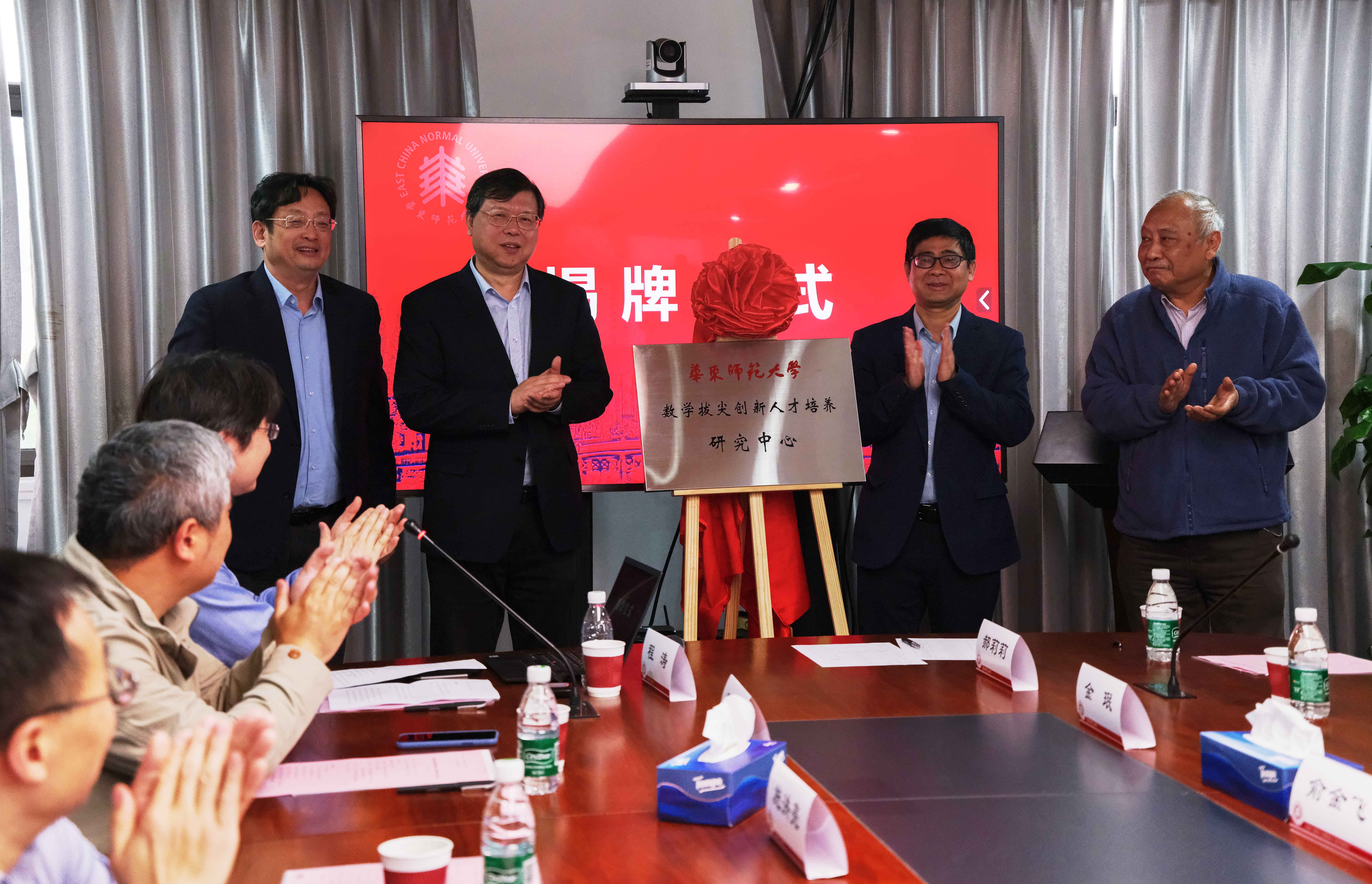 永利皇宫登录官网副校长施国跃、数学科学学院教授熊斌、数学科学学院院长吕长虹、数学科学学院教授周青为研究中心揭牌(左起)