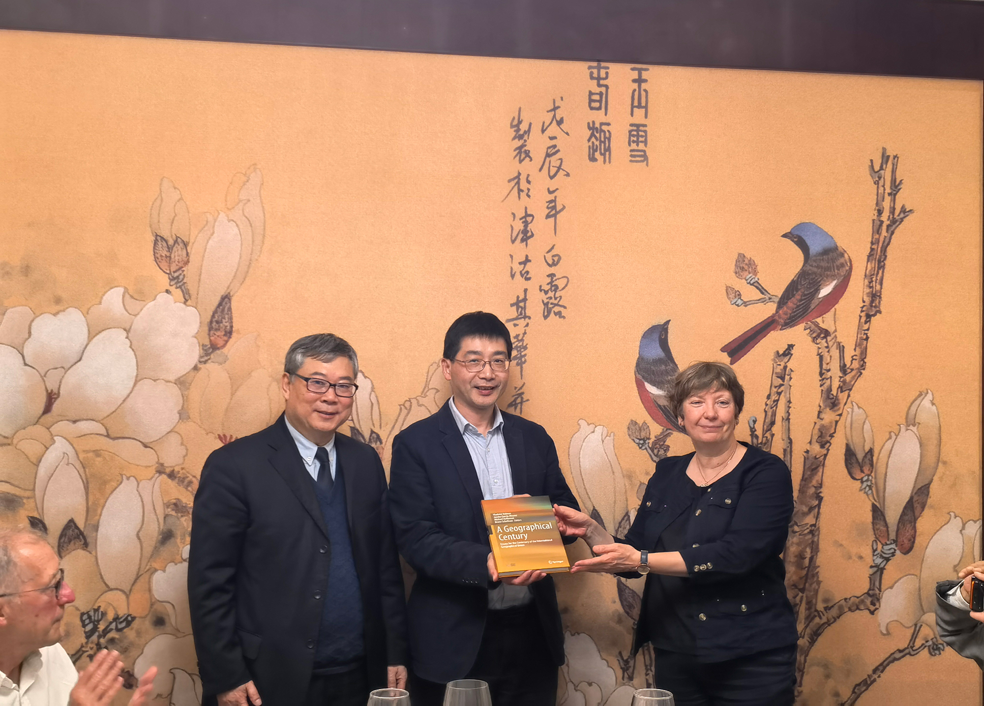 会后,IGU执行委员会成员与华东师大地理学院代表合影,Nathalie Lemarchand教授向华东师大副校长顾红亮、地理科学学院院长张国友赠书《地理世纪:国际地理联合会成立一百周年论文集(A Geographical Century: Essays for the Centenary of the International Geographical Union)》。