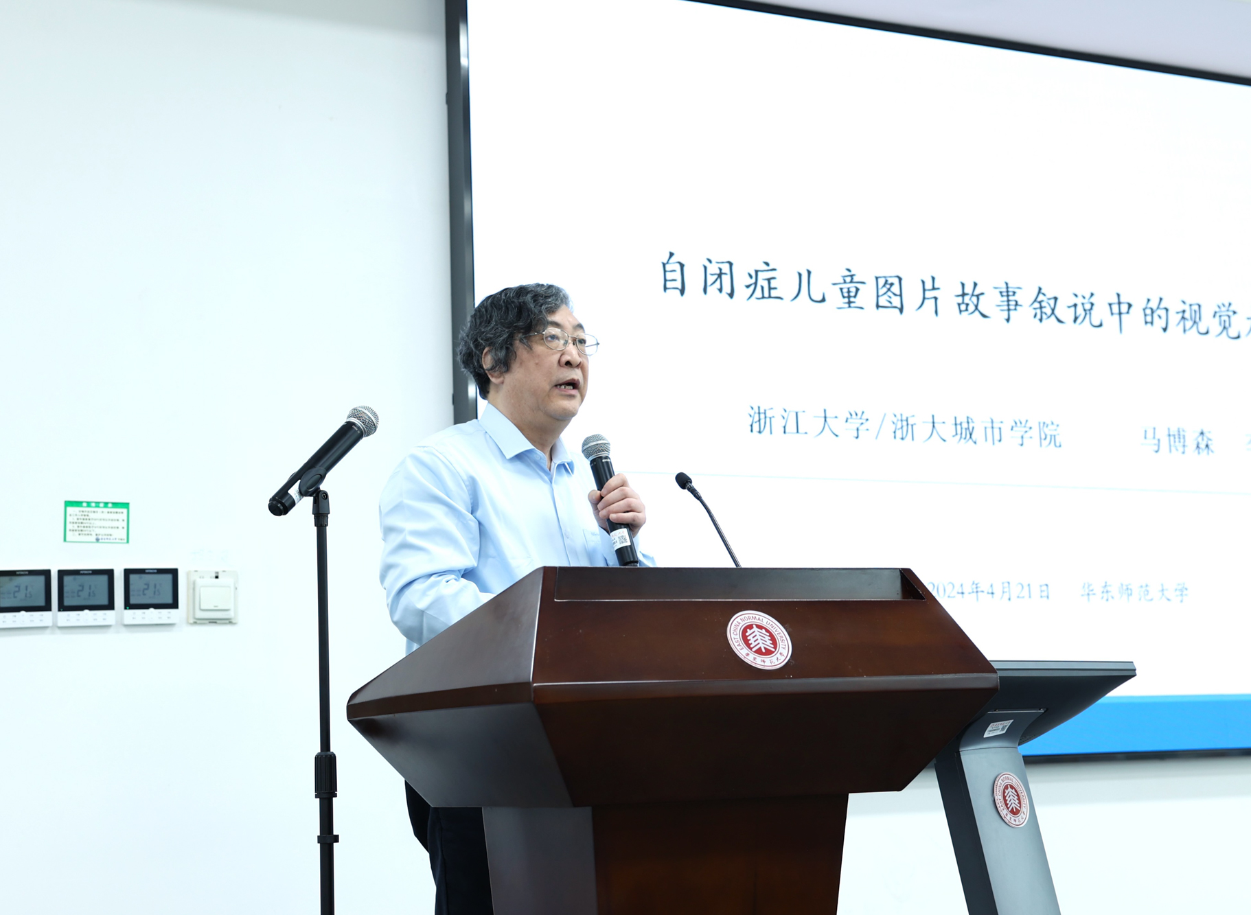 马博森教授在报告 “自闭症儿童图片故事阅读与叙说中的视觉加工研究”中支持了弱中央统合理论假设,认为自闭症儿童主要表现出整体统合能力不足,加工方式呈碎片化,并且对次要信息关注较多等特征,强调要加强教育语言学的社会服务功能。报告由西安交通大学马晓梅教授主持。