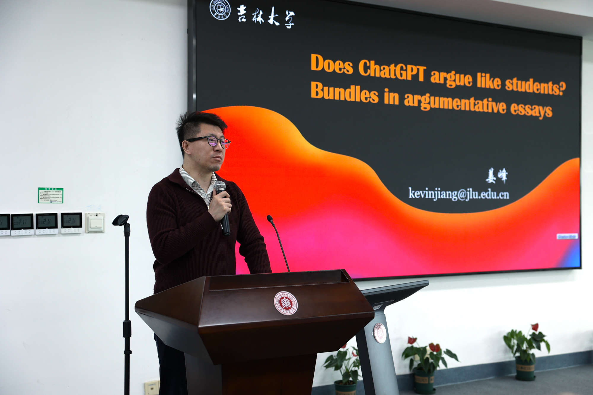 姜峰教授在报告“Does ChatGPT Argue Like Students? Bundles in Argumentative Essays”中通过对比语料库LOCNESS和ChatGPT生成的议论性文本,发现学生和ChatGPT在词块的使用比例、结构类型以及功能类型上都有较大的差异,进而指出这些结果对于如何更好地识别ChatGPT文本以及如何让ChatGPT更好地辅助而非替代人类文本提供了启示。报告由北京外国语大学范琳教授主持。