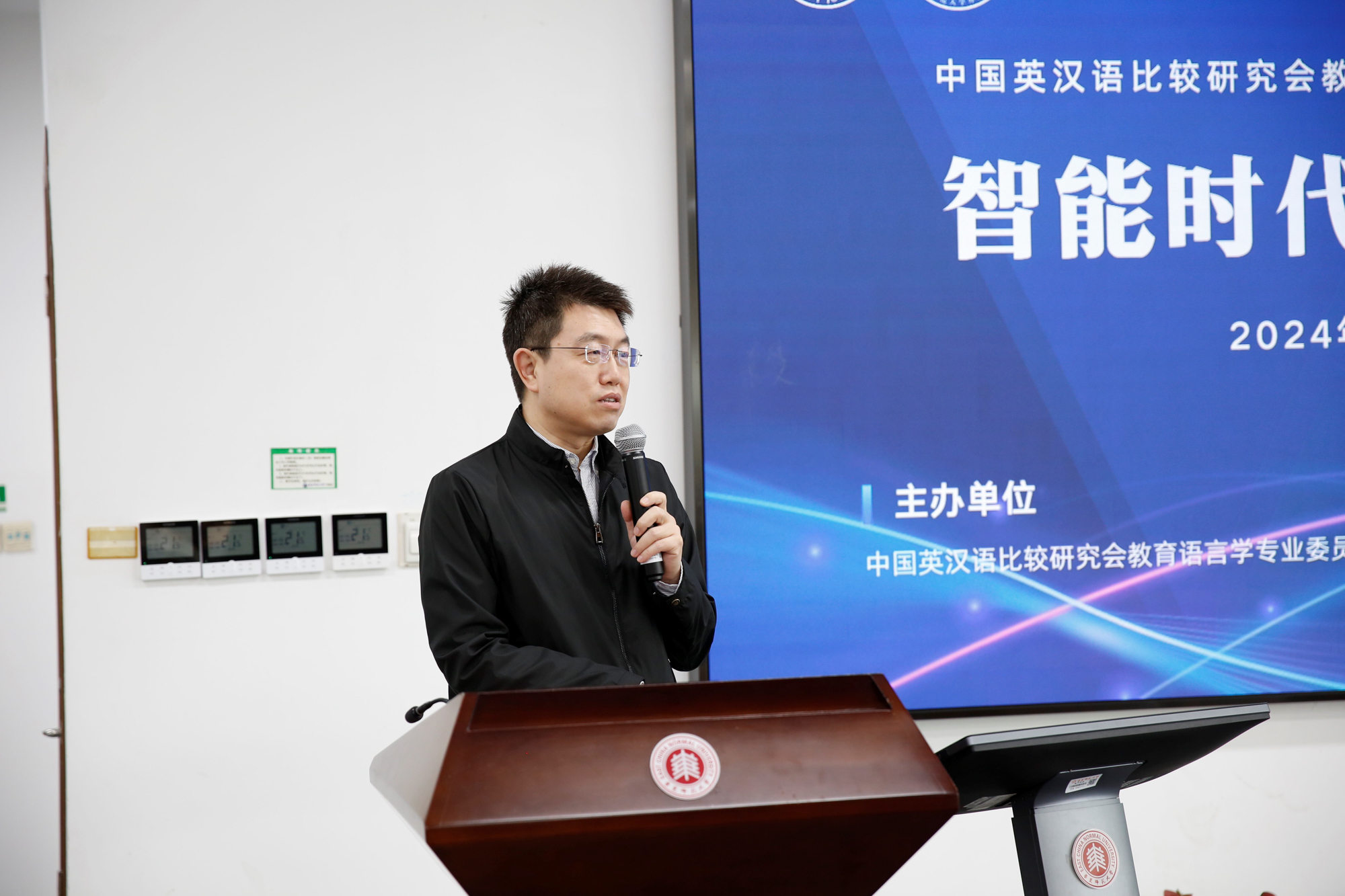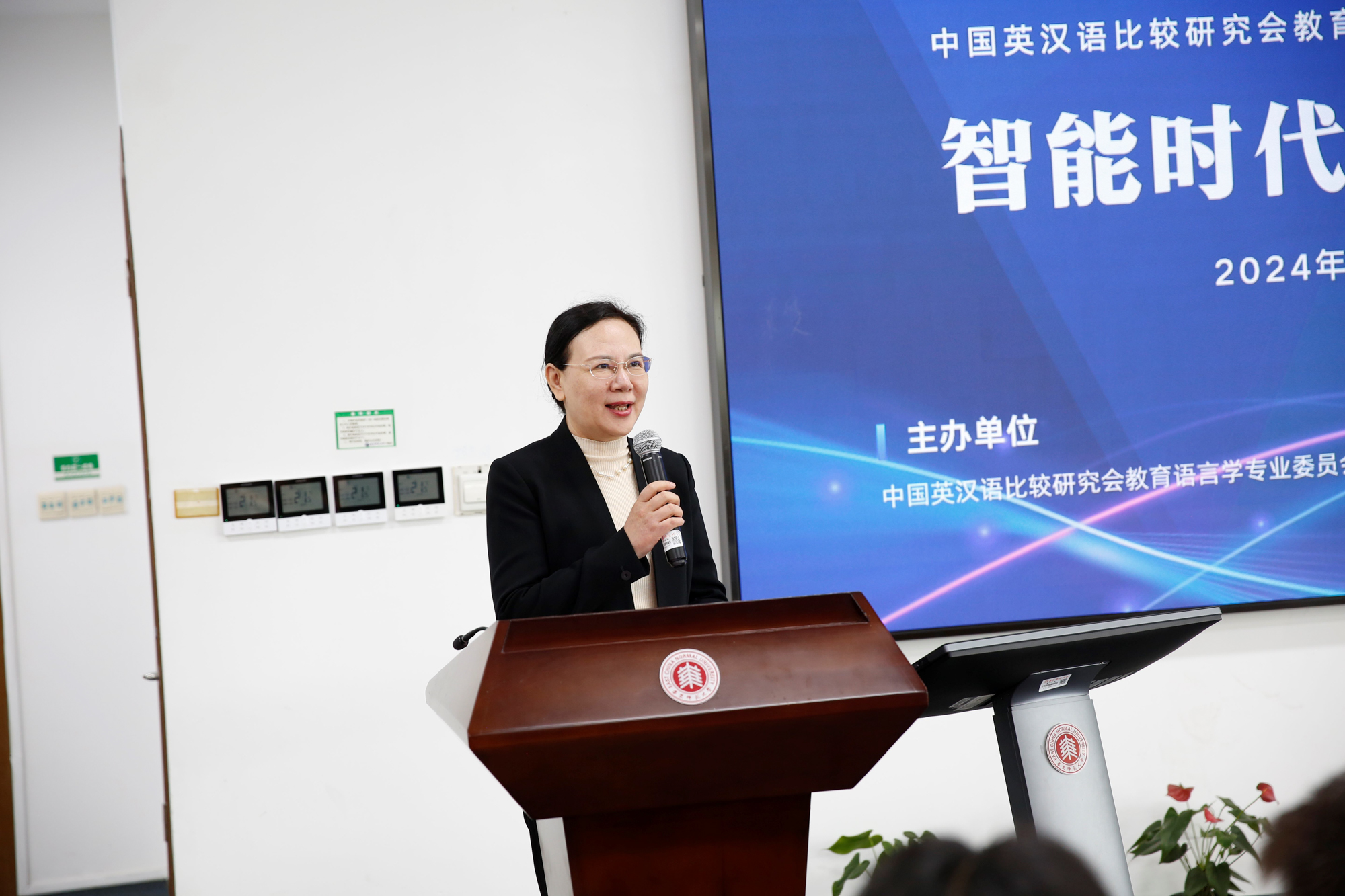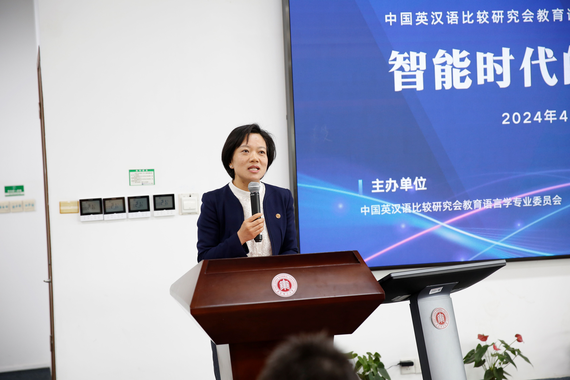 外语学院党委书记韩春红主持开幕式。她提到,教育数字化转型已经成为世界范围内教育变革的主要方向,教育语言学会的各位专家齐聚一堂,讨论智能时代的外语教育,正当其时,也恰逢其势,尤其需要倾力施为。