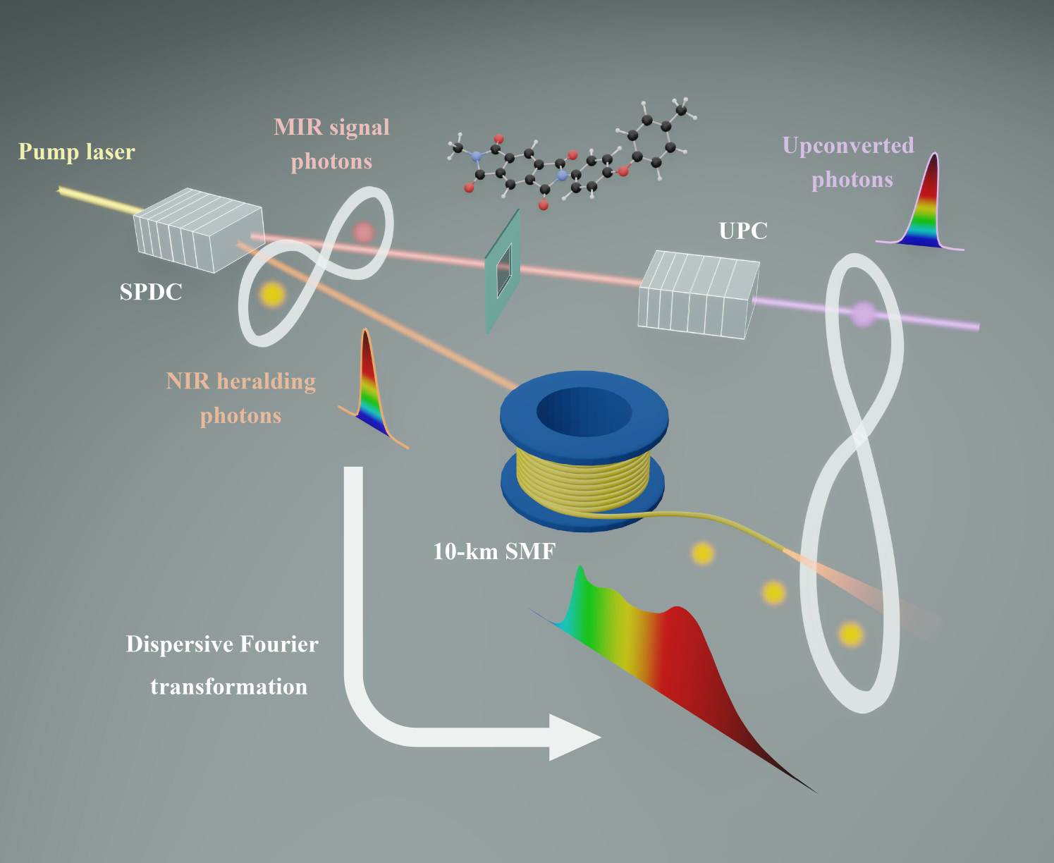 中红外光谱能够揭示多种分子的基础吸收带和复杂化合物独特的光谱特征,是研究物质结构的重要工具。傅里叶变换红外(FTIR)光谱仪作为中红外光谱的常规测量仪器,主要构成部件为干涉仪系统,除结构复杂、体积庞大外,商售中红外探测器效率低、噪声大等问题严重影响了中红外光谱的研究。中红外频率上转换通过非线性和频过程,将中红外光子与强泵浦耦合并利用硅基单光子探测器实现有效探测。其优势是消除了对中红外探测器和干涉仪的需求,从而实现稳定且紧凑的结构。目前,使用高功率泵浦激光结合高亮度中红外照明是提取高信噪比光谱的直接方法。但在超灵敏中红外频率上转换的相关应用场景中,需要在复杂环境中有效地提取微弱信号,此时强泵浦在非线性晶体中产生的参量噪声难以滤除,影响了探测灵敏度。由于光敏样品和量子相干现象对光学探针的强度存在限制,在中红外上转换光谱中使用的明亮中红外照明并不适合此类应用场景。此外,红外光谱学研究均需要使用光谱仪、干涉仪或昂贵的多像素探测器才可实现中红外光谱采集。面对弱光照下进行样品高灵敏光谱分析的需求,提升探测灵敏度,降低噪声对光谱测量影响并避免机械扫描结构,是亟待解决的关键难点。