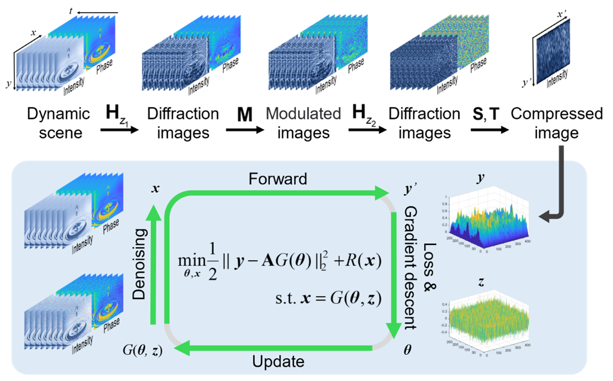 针对这一领域内公认的科学性难题,张诗按教授领导的联合研究团队巧妙地将压缩感知原理、相干调制成像与时空偏转成像深度融合,提出了一种可以同时实现定量超快强度和相位成像的压缩感知型相干调制超快成像(CS-CMUI)技术。如图2所示,该技术将被测动态场景的强度和相位信息调制到脉冲光场中,通过压缩感知原理在单次曝光测量中获取脉冲光场复振幅信息的压缩快照,再结合深度学习与迭代计算的免训练图像重构算法,精确还原待测动态场景的时空强度和相位信息。