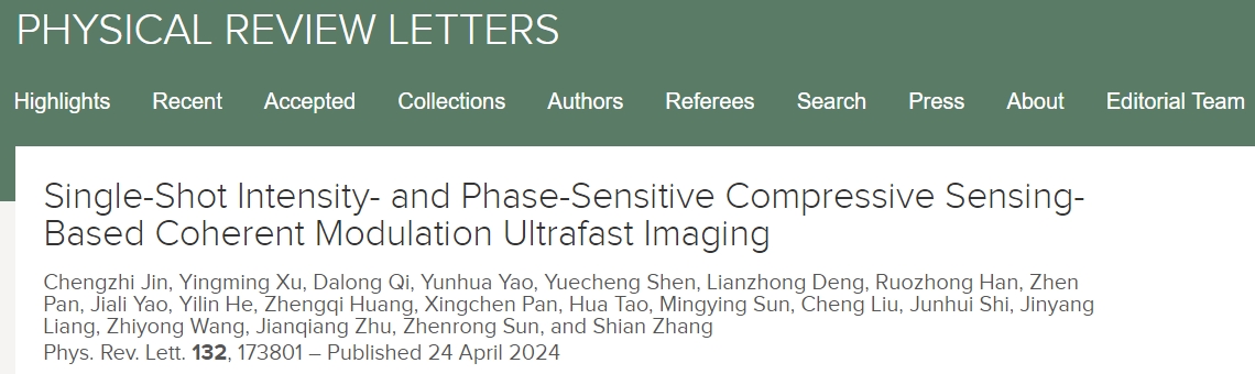 近日,永利皇宫登录官网精密光谱科学与技术国家重点实验室齐大龙研究员、张诗按教授团队和中国科学院上海光学精密机械研究所朱健强研究员团队开展合作,在单次多幅超快复振幅光学成像技术研究方面取得重要进展。相关研究成果以Single-shot intensity- and phase-sensitive compressive sensing-based coherent modulation ultrafast imaging为题,于2024年4月24日在线发表于物理学顶级期刊Physical Review Letters上。