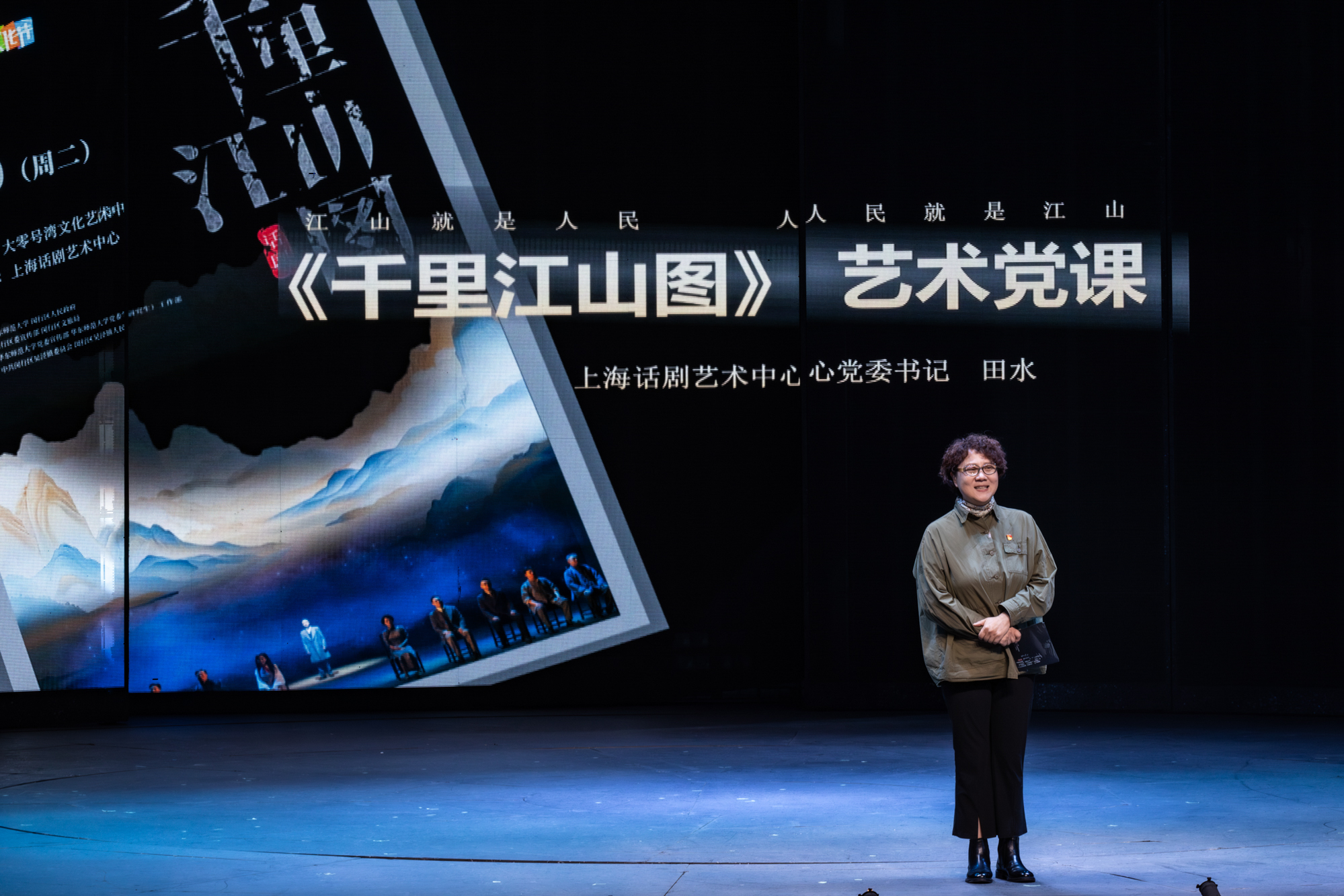 演出开始前,上海话剧艺术中心党委书记田水和青年演员张瑞涵、王维帅以“江山就是人民,人民就是江山”为主题为现场观众讲授《千里江山图》艺术党课。