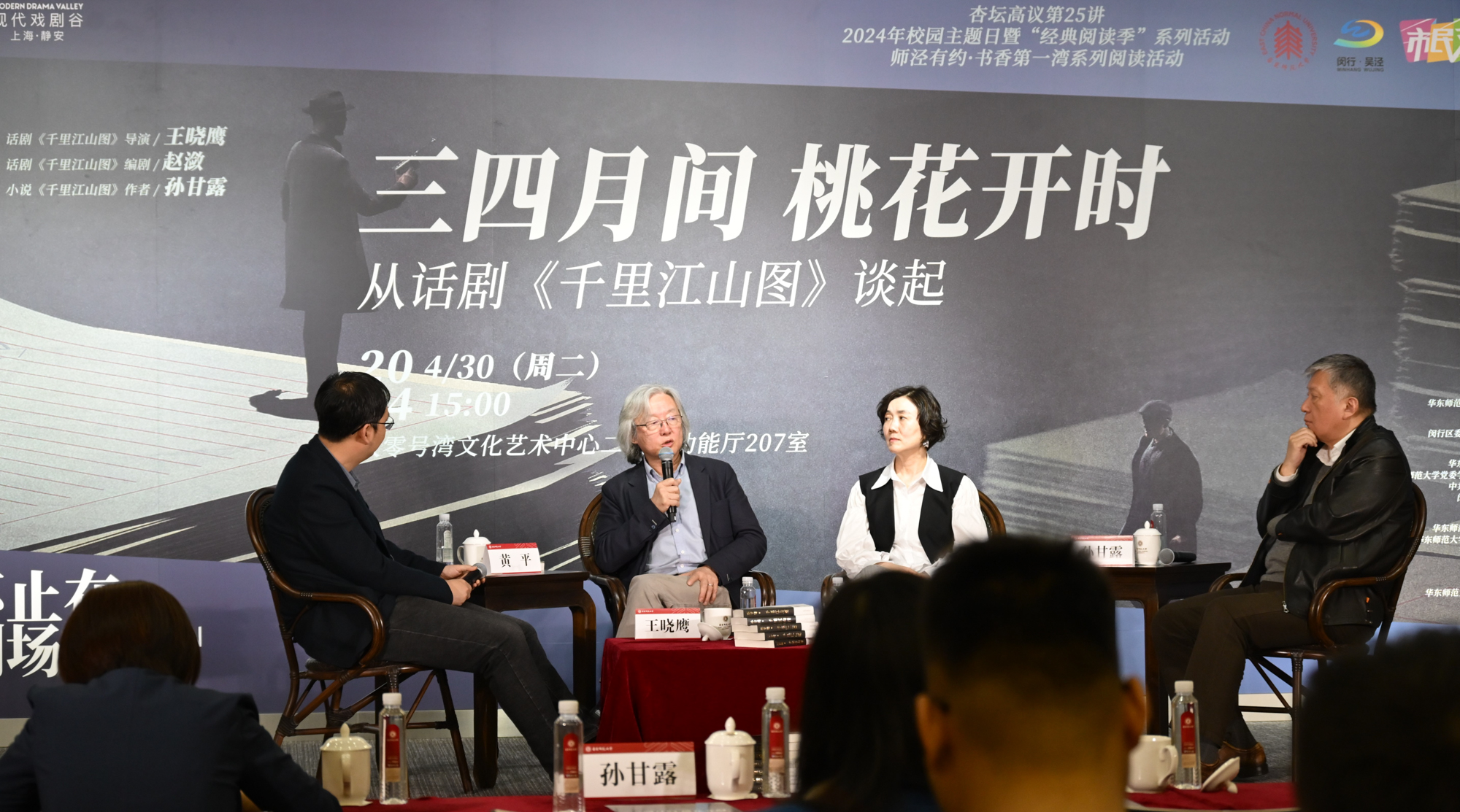 4月30日下午,《千里江山图》原著作者孙甘露、编剧赵潋、话剧导演王晓鹰与中文系教授黄平共同做客大零号湾文化艺术中心,文艺圈大咖们跨界畅谈从小说创作到舞台演绎,为现场观众讲述打开《千里江山图》的另一种方式。