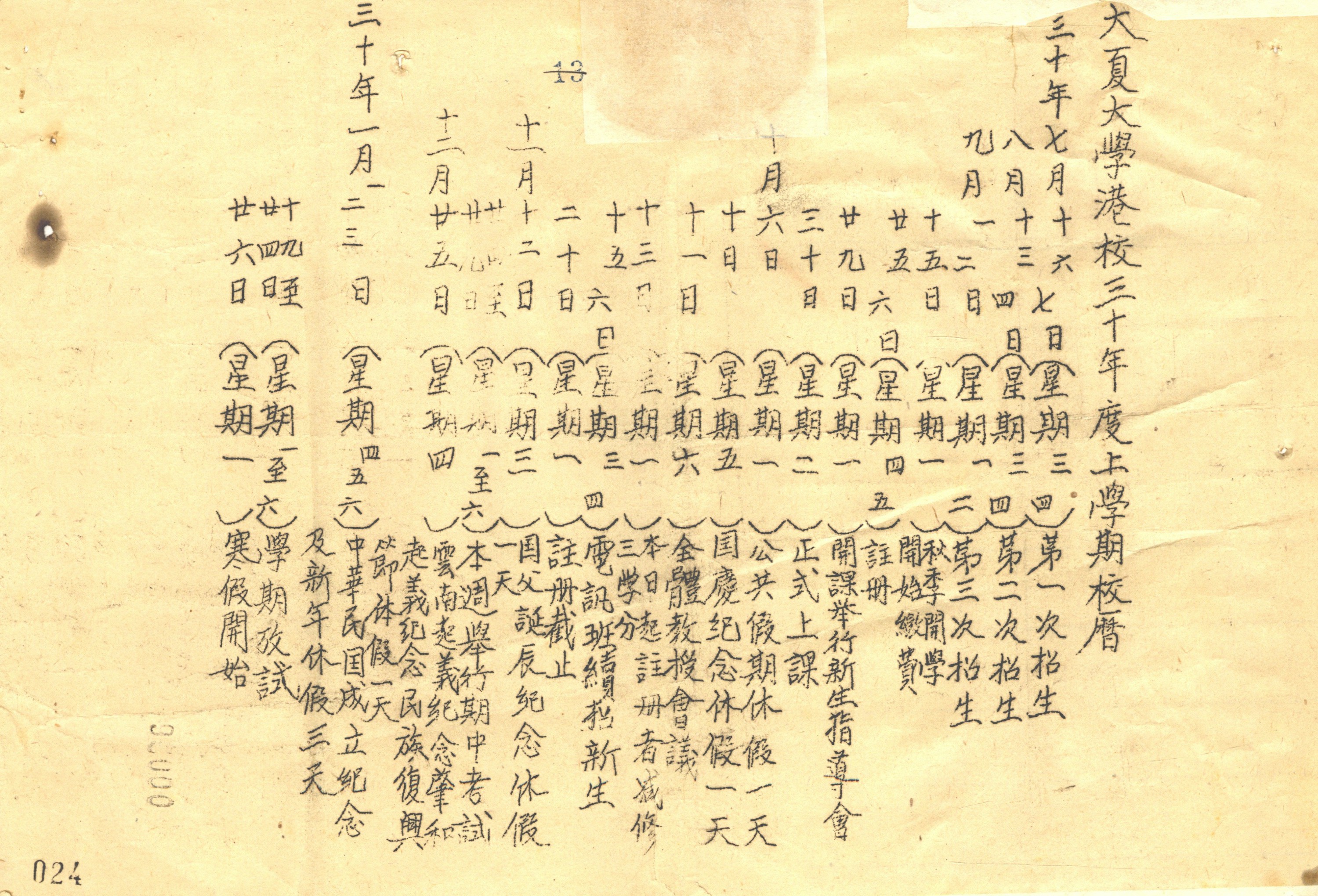 1941年度大夏港校上学期校历