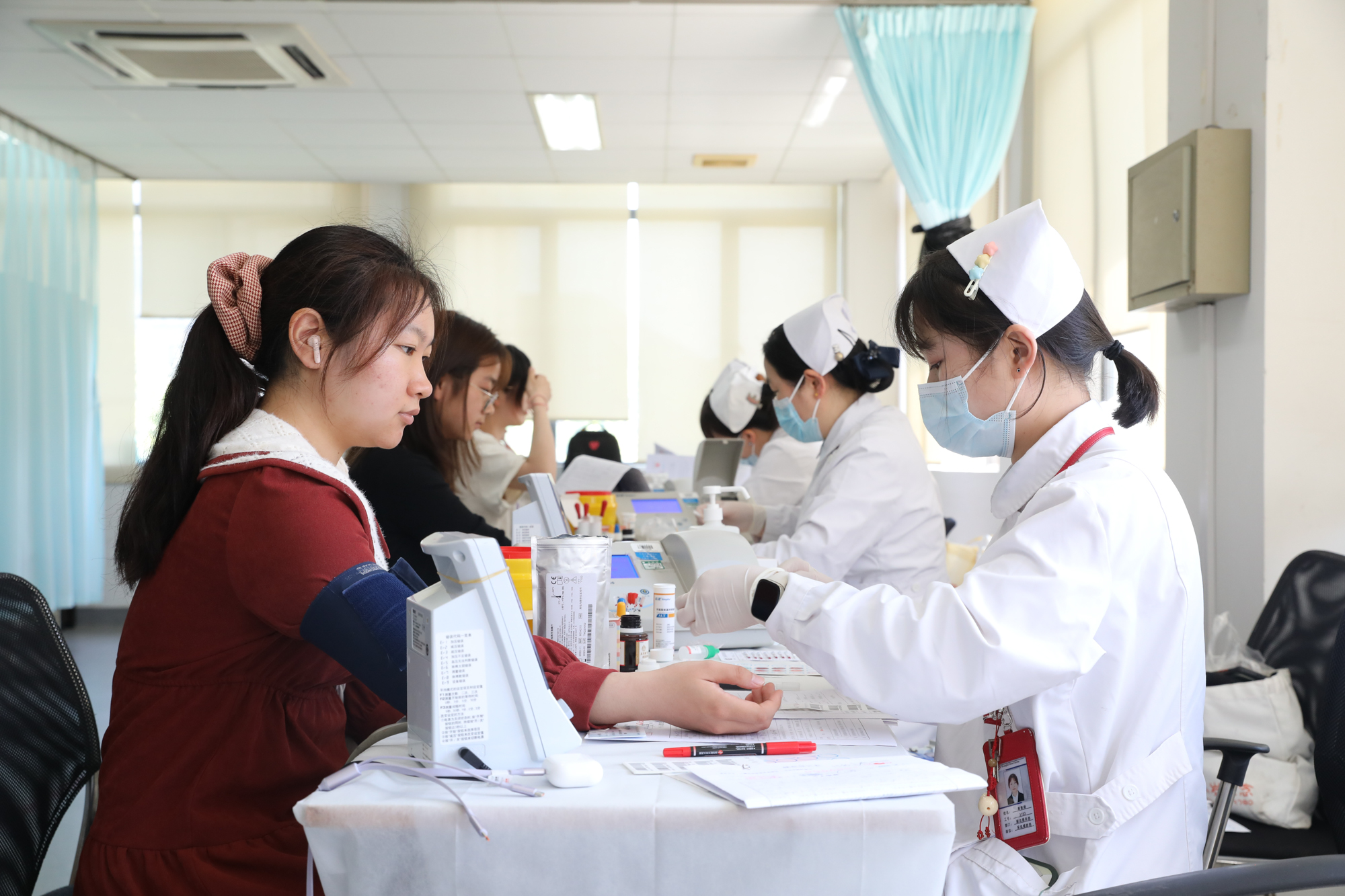 经过精心有序的组织,校医院与院系的充分动员,师生们的献血热情高涨。在医务人员和学生志愿者的指引下,同学们井然有序地填写登记表、进行健康征询、血液初筛等流程。检查结果合格后,依次进入献血现场,卷起袖子,献出自己的一份爱心。在同学们献血后,志愿者也及时地递上暖心的红枣茶和巧克力,爱也在此刻完成闭环。献血的师生拿到无偿献血证时,大家脸上都幸福满溢。