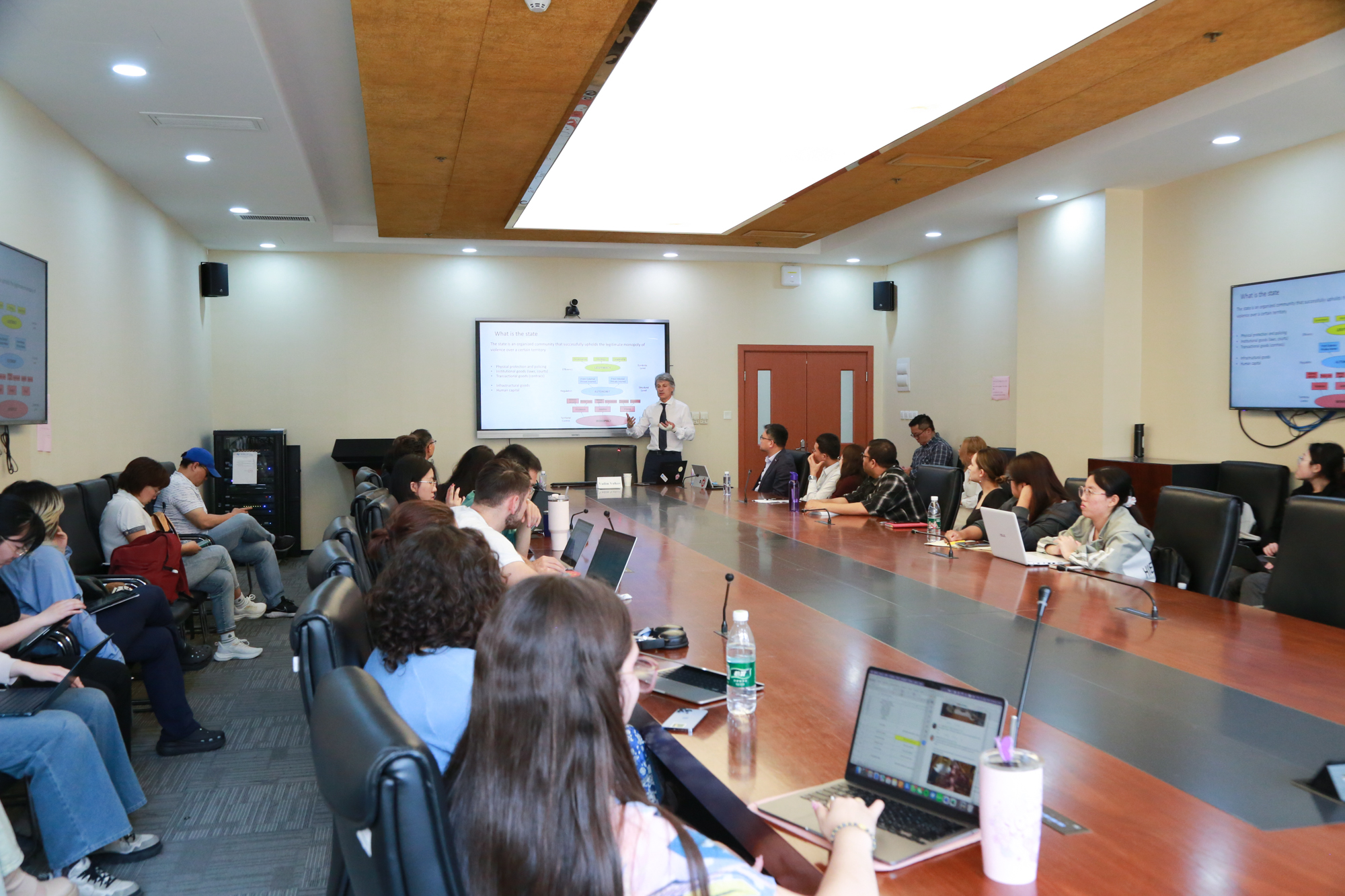 5月15日下午,俄罗斯圣彼得堡欧洲大学校长瓦迪姆·沃尔科夫教授受邀作“1991-2021年俄罗斯的国家转型”主题讲座,俄罗斯研究中心执行主任刘军、张昕、徐广淼等老师和30余名中外研究生一起在普陀校区出席了讲座。俄罗斯研究中心副主任张昕副研究员主持讲座。