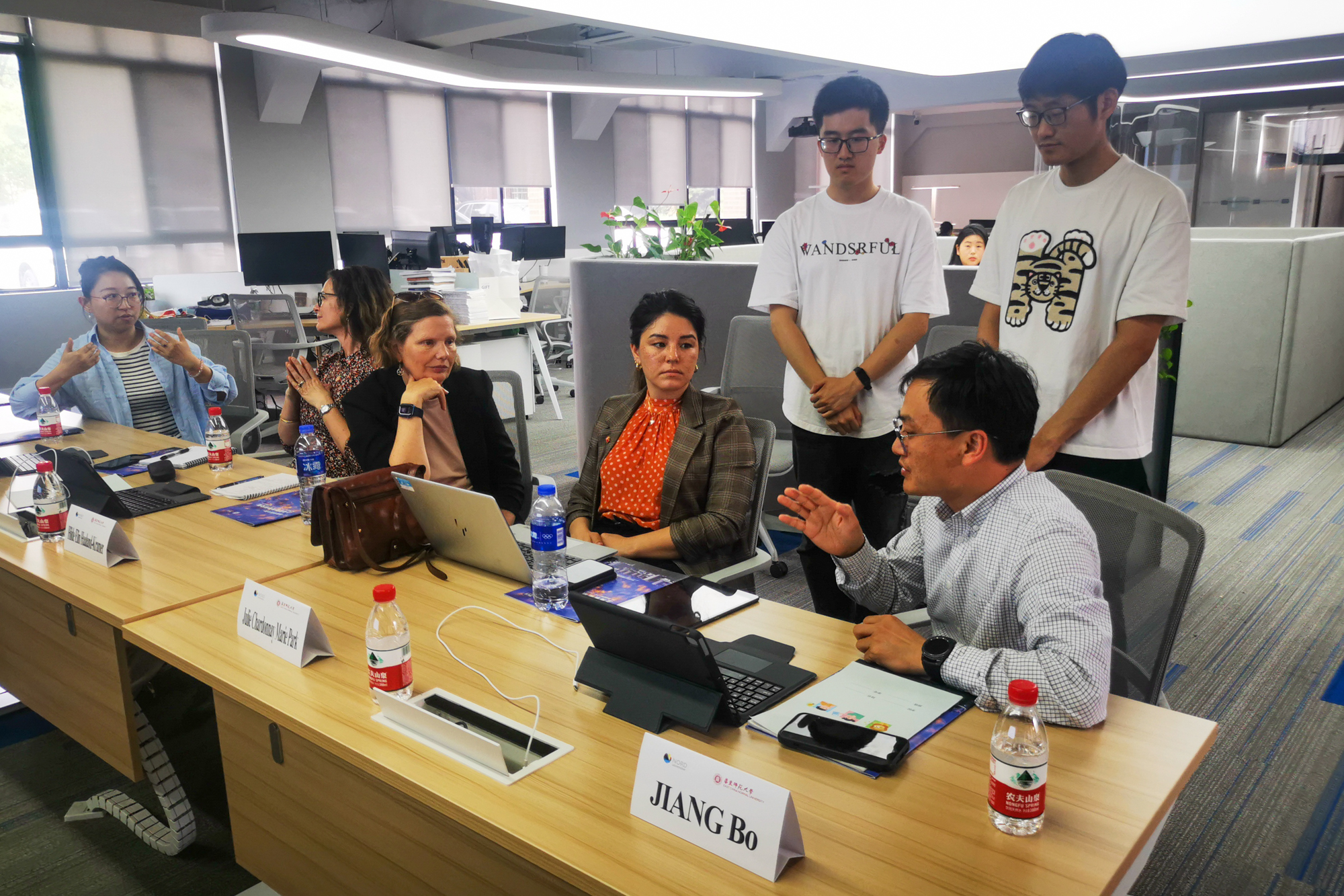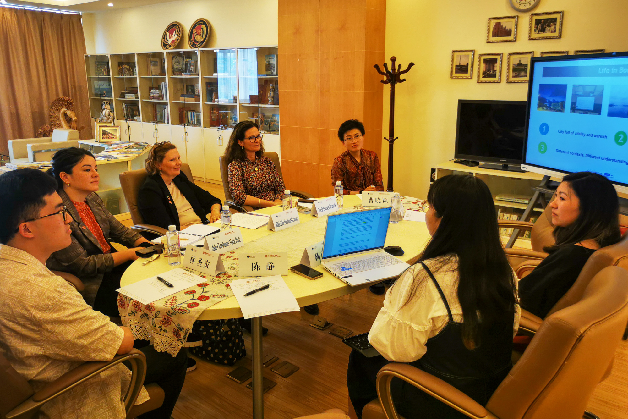 随后,代表团在华东师大政治与国际关系学院就中挪教育合作项目进行座谈。国际合作与交流处处长助理曹晓颖对代表团到访表示欢迎,介绍了华东师大与欧洲院校、尤其是与挪威高校的合作情况。挪威诺德大学商学院中挪俄项目协调员Igor Khodachek副教授回顾了两校在智慧教育(Edusmart)项目合作中已取得的成果,提出了双方在学生培养与联合学术研究上继续推进的发展方向。政治与国际关系学院中挪俄三方联合培养项目硕士生杨莹泽、林圣寅、温昔倍分别向代表团呈现了他们在诺德大学撰写完成的硕士学位论文,分享了在挪威的学习与生活经历。政治与国际关系学院国际合作项目协调员陈静向代表团介绍了中挪俄三方联合培养项目创设背景、发展过程,并就代表团提出的有关问题进行了回应。代表团肯定了现有项目的合作成效,并就中挪学生交换、联合培养项目、科研合作前景等问题同与会人员进行了进一步交流,希望未来在人才培养、校际交流上深化合作。