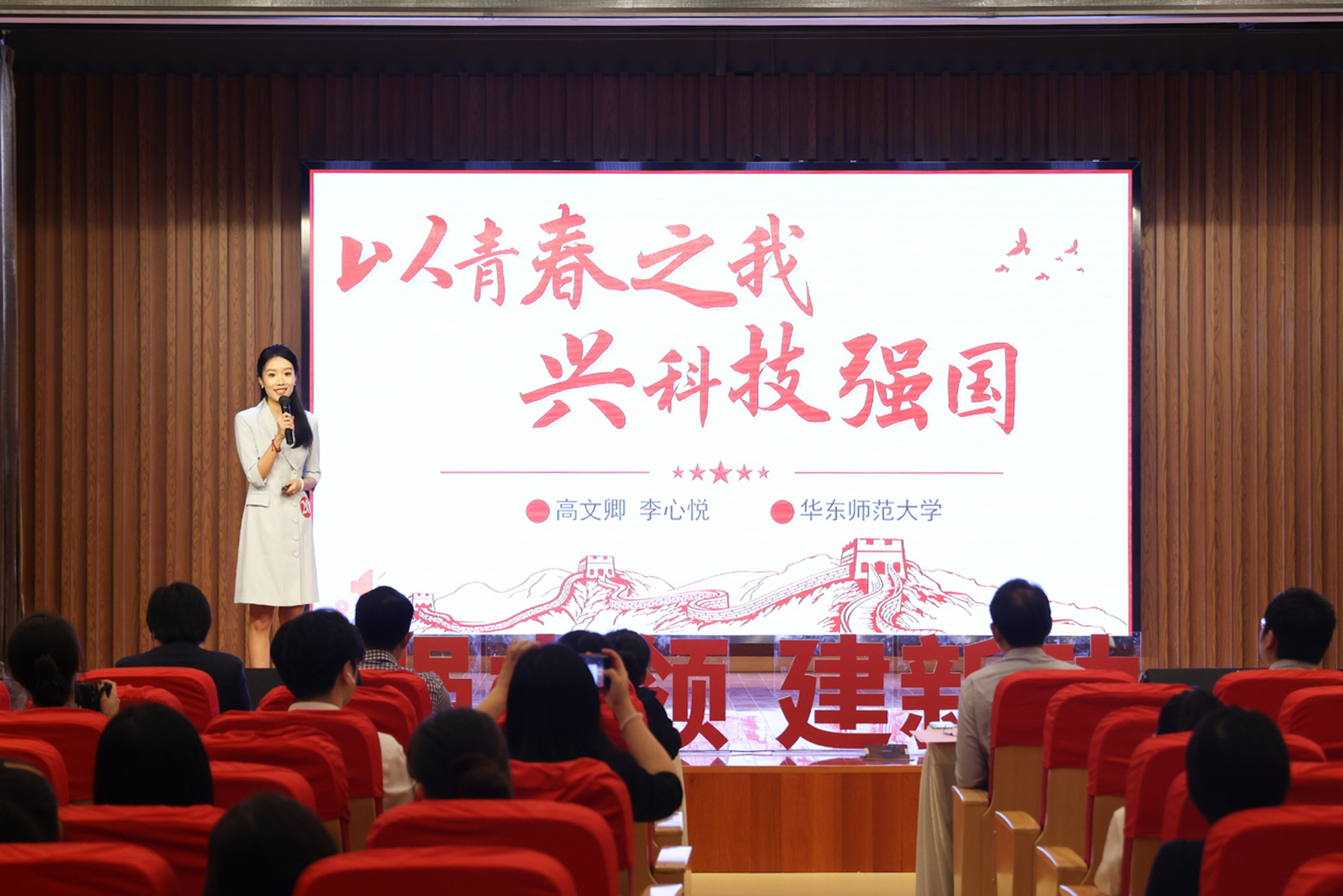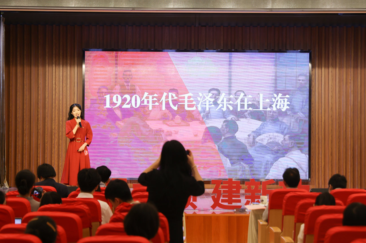 高文卿、李心悦以《以青春之我,兴科技强国》为题,以“大零号湾”为切入点,从上海张江科学城的建设,遵义市板桥镇的罗世杰一家三代人矢志航天,联想到自身作为讲解员向世界讲述科技强国的难忘经历,讲述青春使命、青年担当。沈顾欣瑜围绕《1920年代毛泽东在上海》主题,立足“上海”这一中国共产党诞生地,通过三处地点转换讲述毛泽东的上海故事,描绘了一幅中国共产党早期奋斗历程的红色画卷。
