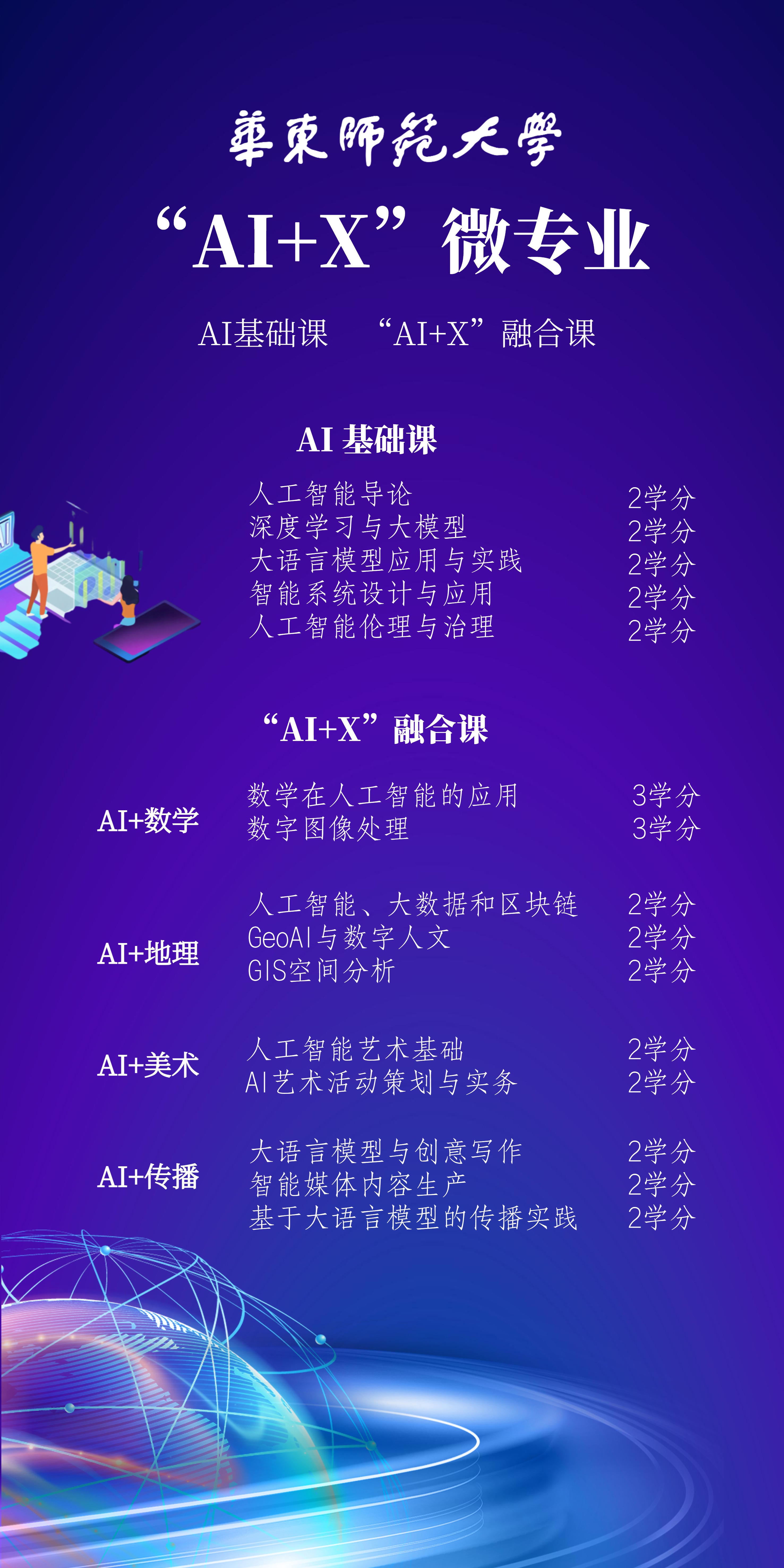 每个专业领域需选修2-3门AI基础课(共5门)和“AI+X”融合课的2-3门课程,共10-14学分,修读周期为一年。