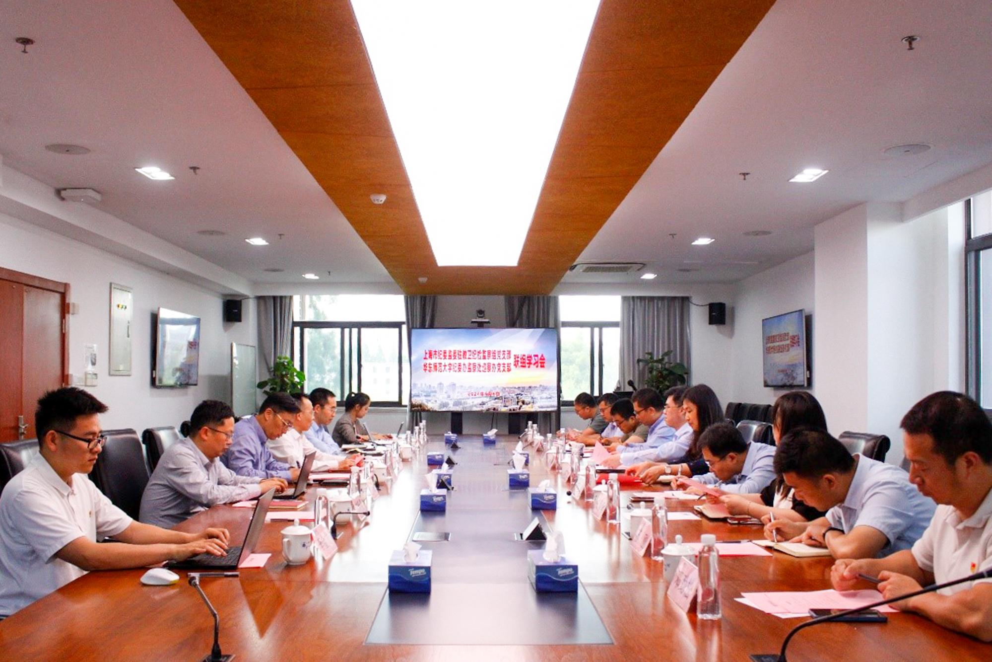 曹友谊指出,驻教卫纪检监察组与华东师大纪委依托党支部平台,以本次联组学习为开端,建立了常态化交流互动的新机制。曹友谊介绍了学校纪委推进“一校一策”、强化政治监督、开展专项巡察以及纪律审查等工作情况,并希望驻教卫纪检监察组在工作上给予更多指导与帮助,协力推进执纪工作和纪检监察研究院建设。