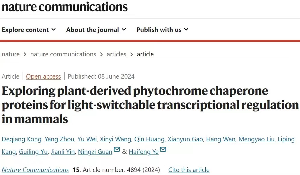 2024年6月8日,永利皇宫登录官网生命科学学院、上海市调控生物学重点实验室、医学合成生物学研究中心叶海峰团队在 Nature Communications 期刊发表了题为“Exploring plant-derived phytochrome chaperone proteins for light-switchable transcriptional regulation in mammals”的研究长文。该研究首次发现植物来源的光敏色素伴侣蛋白在哺乳动物细胞中具备转录激活子活性,进一步开发出了一种新型的光开关转录调控系统(PTRC),为生命科学基础研究和生物医学工程应用研究带来了更大的可能性。