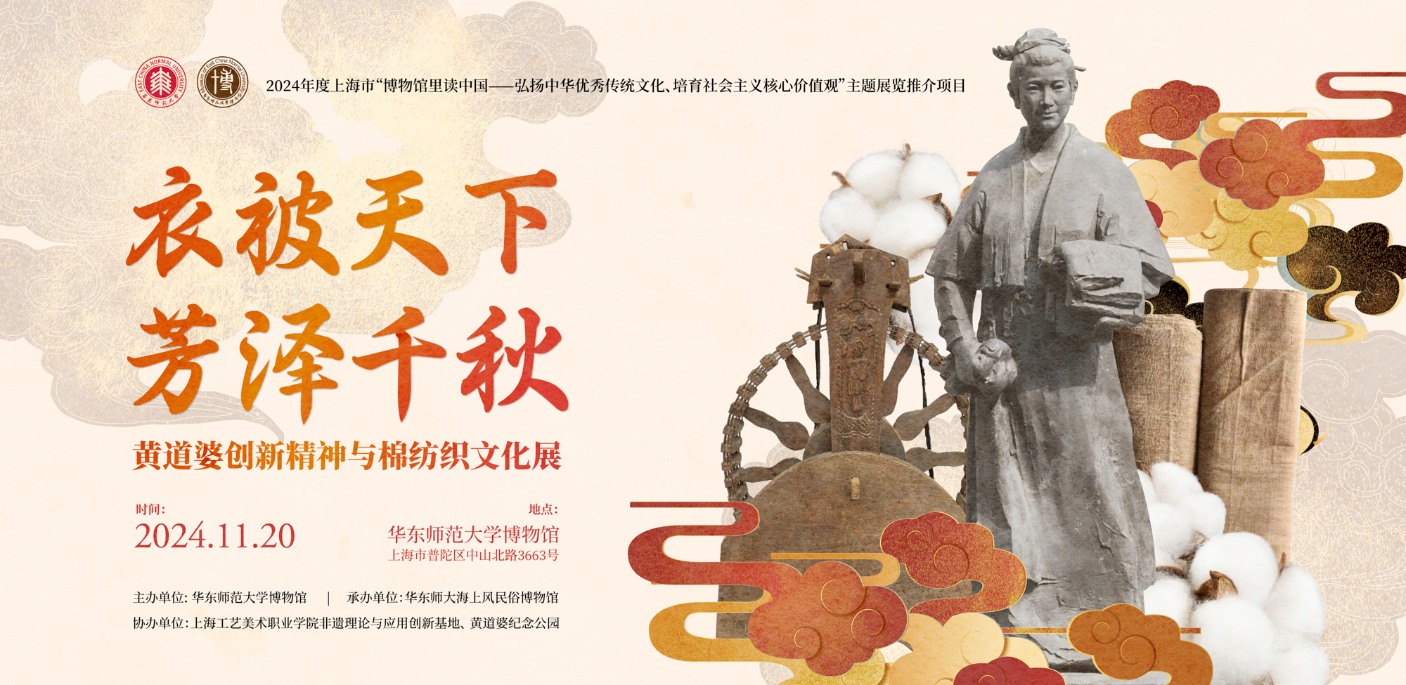 近日,上海市文物局开展了2024年度上海市“博物馆里读中国——弘扬中华优秀传统文化、培育社会主义核心价值观”主题展览项目评选和推介活动。经专家组评议等,华东师大博物馆申报的“衣被天下 芳泽千秋——黄道婆创新精神与棉纺织文化展”获评2024年度上海市“博物馆里读中国——弘扬中华优秀传统文化、培育社会主义核心价值观”主题展览项目,全市仅有12个展览项目获评,高校博物馆只有2个项目获评。