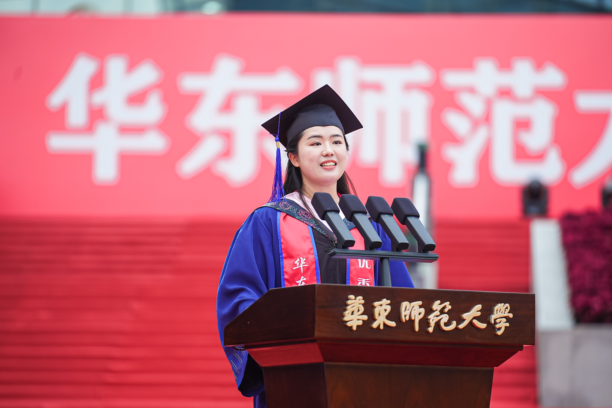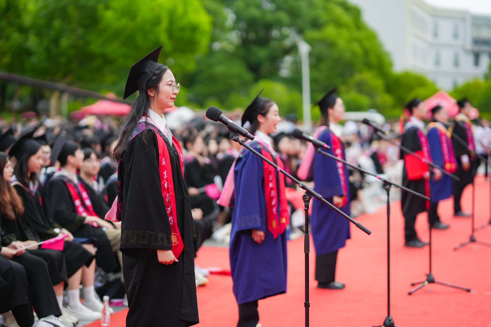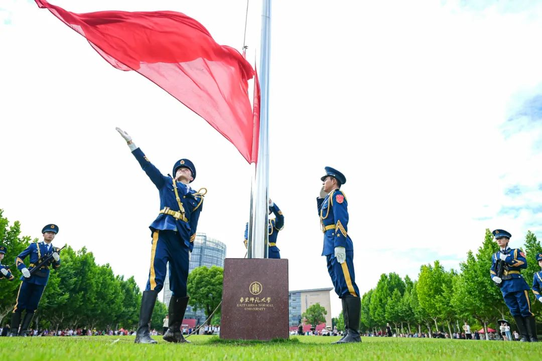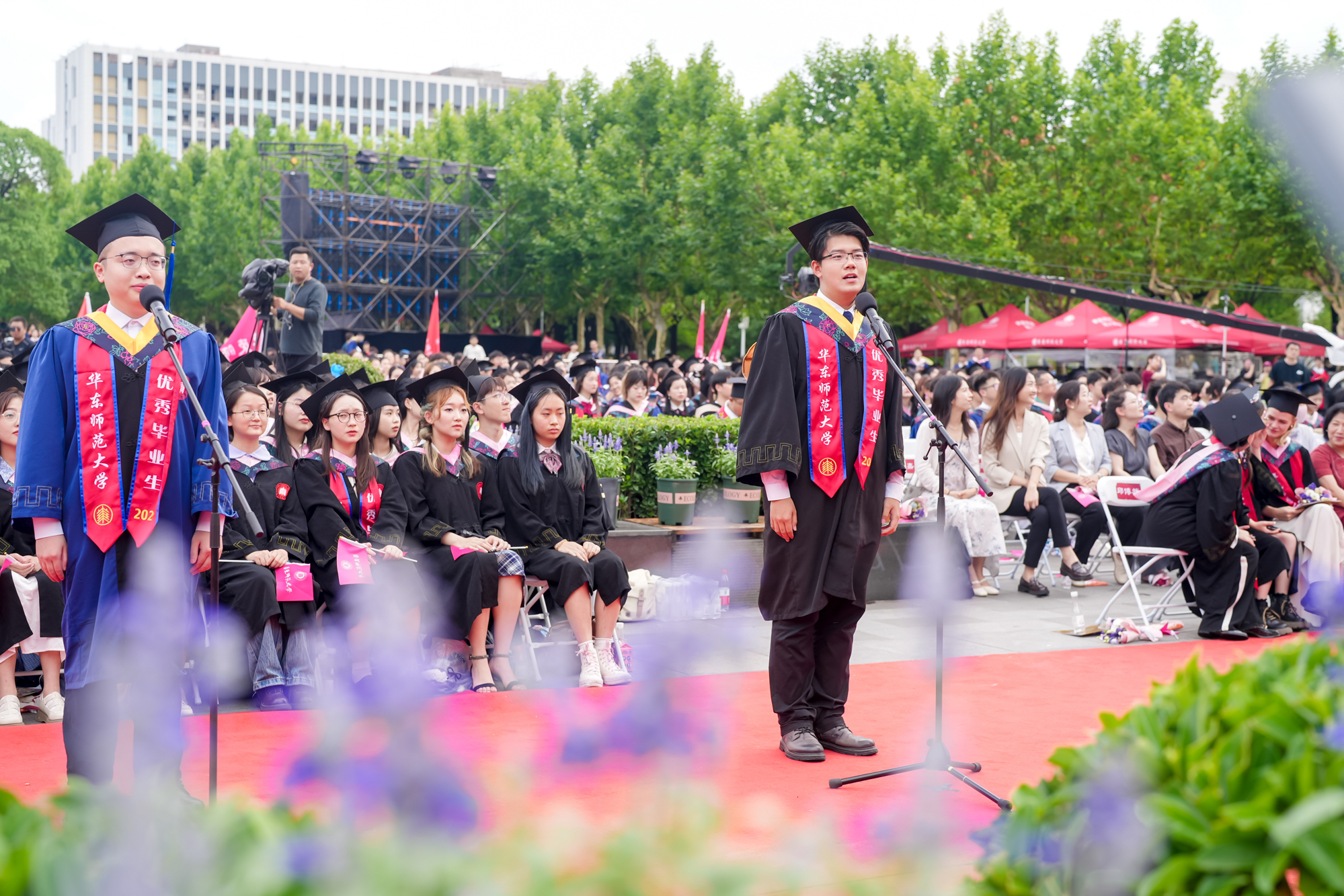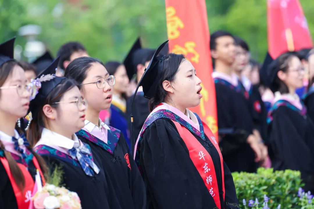 毕业生出征仪式上,直博北京大学的本科生邱博然、将赴江西基层服务社会的硕士生李青竹、投身于科研的博士生孔德强、将赴西部支教的本科生刘婧妤、科技创业的硕士生马圣进、将去上海南洋中学任教的硕士生纪晨毓等六位毕业生,以铿锵有力的朗诵展示了华东师大毕业生踔厉奋发、砥砺前行的风采。