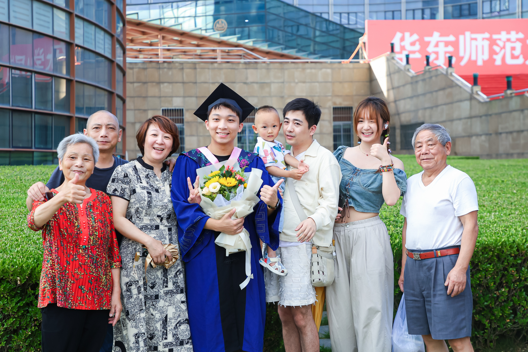 校长排出档期与毕业生合影是华东师大的传统。毕业典礼结束后,在闵行校区图书馆二楼大厅,钱旭红校长身穿大红校长服与毕业生们合影交流。