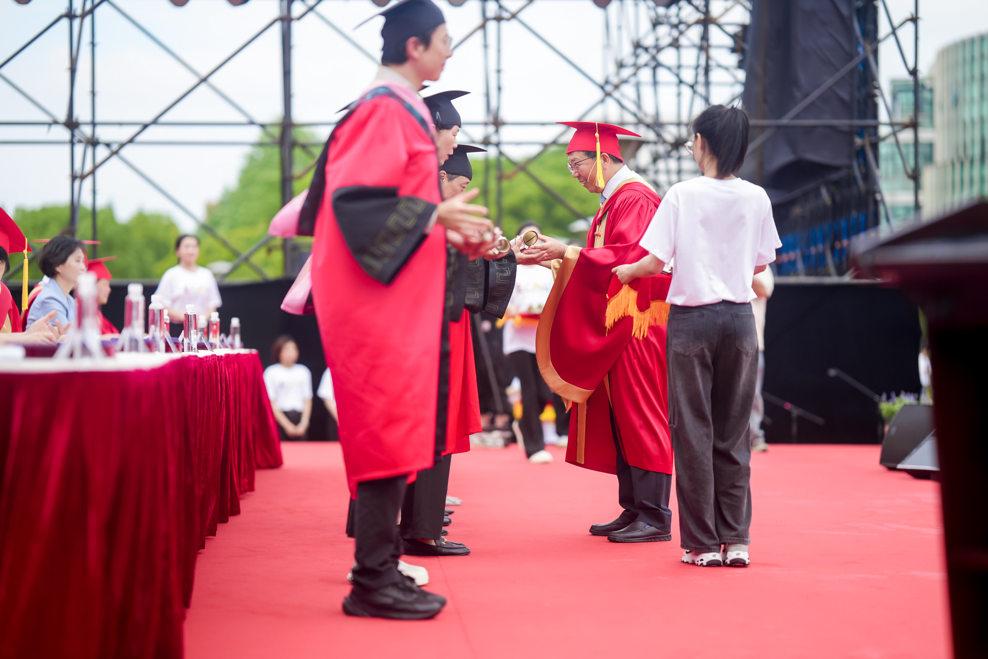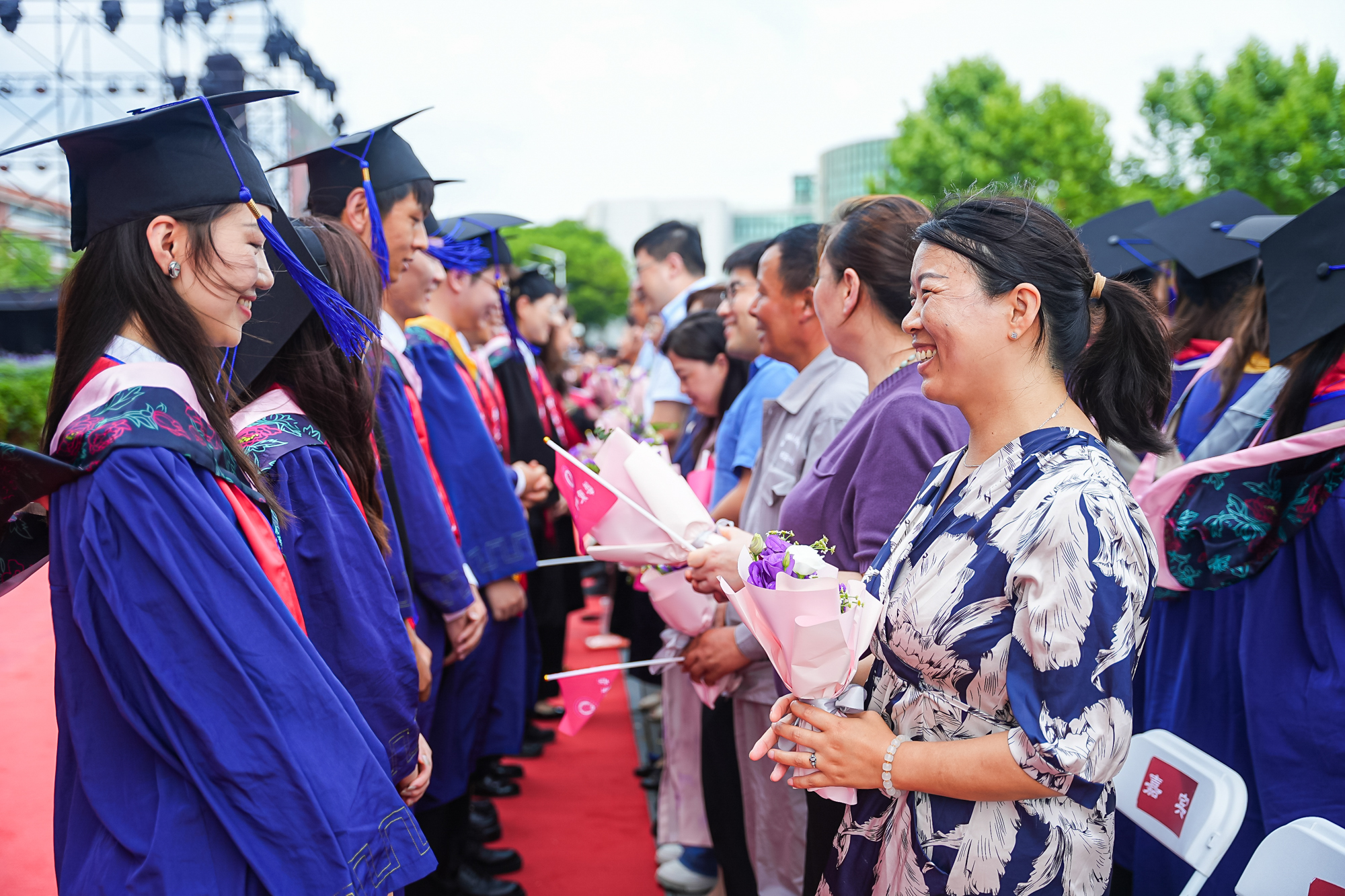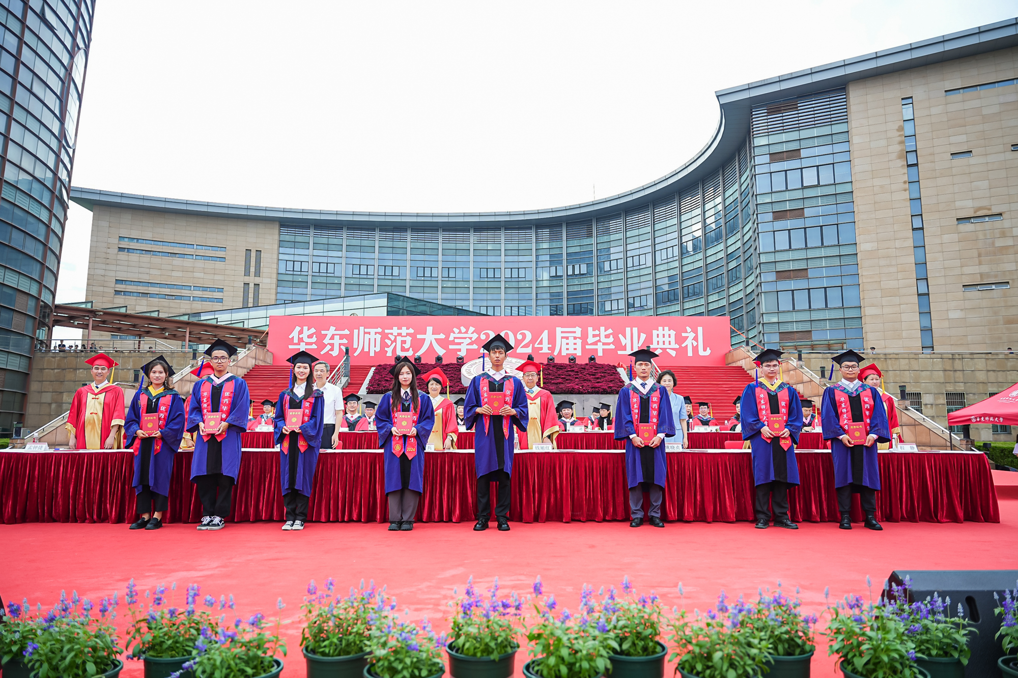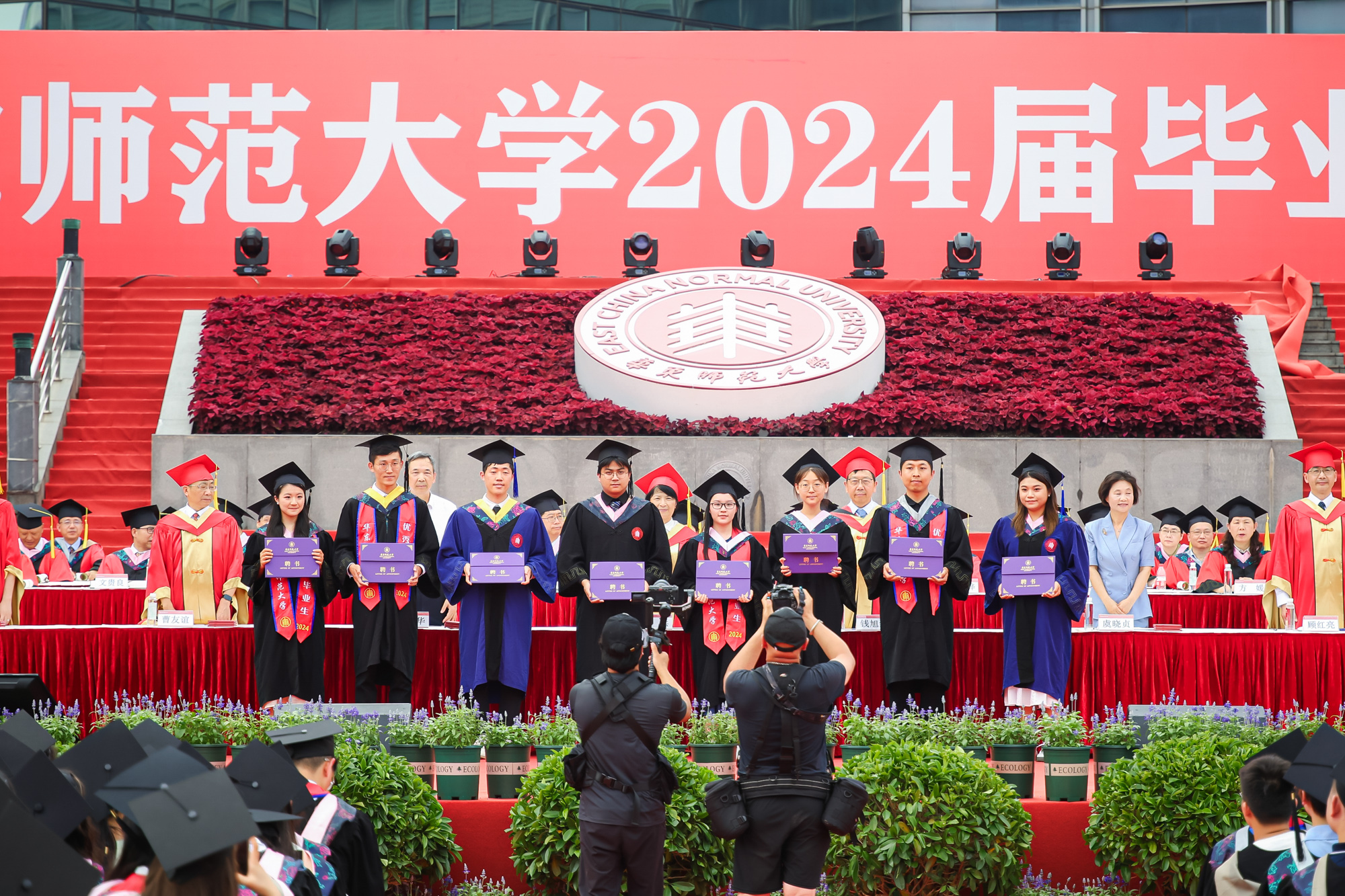 毕业典礼上,校领导与嘉宾为2024届校友联络大使颁发聘书。华东师大聘任220位毕业生为2024届校友联络大使,希望通过校友联络大使,建立校友与学校、校友与校友之间更加广泛而密切的联系,更好地回应校友的关切,服务学校的发展。