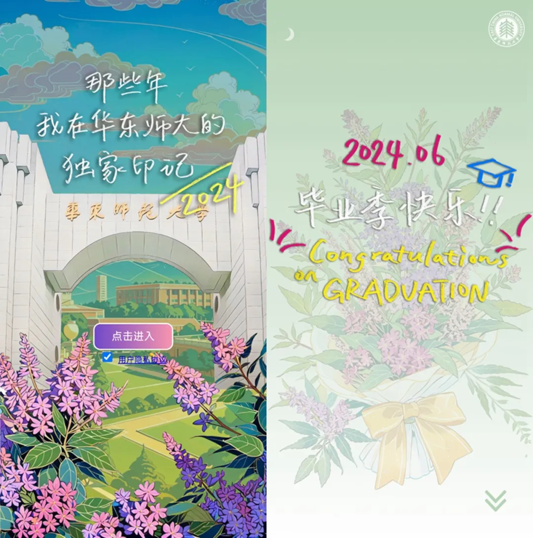 今年,华东师大为2024届毕业生送上一份独一无二的数智礼物《我的“元宇宙”——在华东师大的独家印记》。华东师大一直致力于开展“数智跃升”工程,以数字赋能卓越育人,推动学校高质量发展。这个小程序依托1000余万条毕业生的个性化数据,通过人工智能技术,全方位呈现毕业生的师大记忆与成就,让每个毕业生都收获专属的师大“独家印记”。