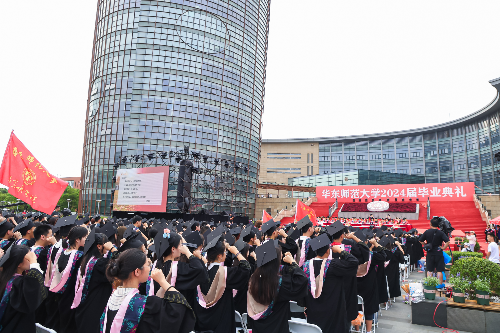 当合唱团演唱的《去明天》的歌声响起,将毕业典礼推向了高潮。“挺膺担当,续写卓越!”在飘扬的校旗下,在全体毕业生一声声激情澎湃的宣誓声中,华东师大毕业生扬帆起航,逐梦而行,将用智慧和汗水书写更加精彩的报国篇章。