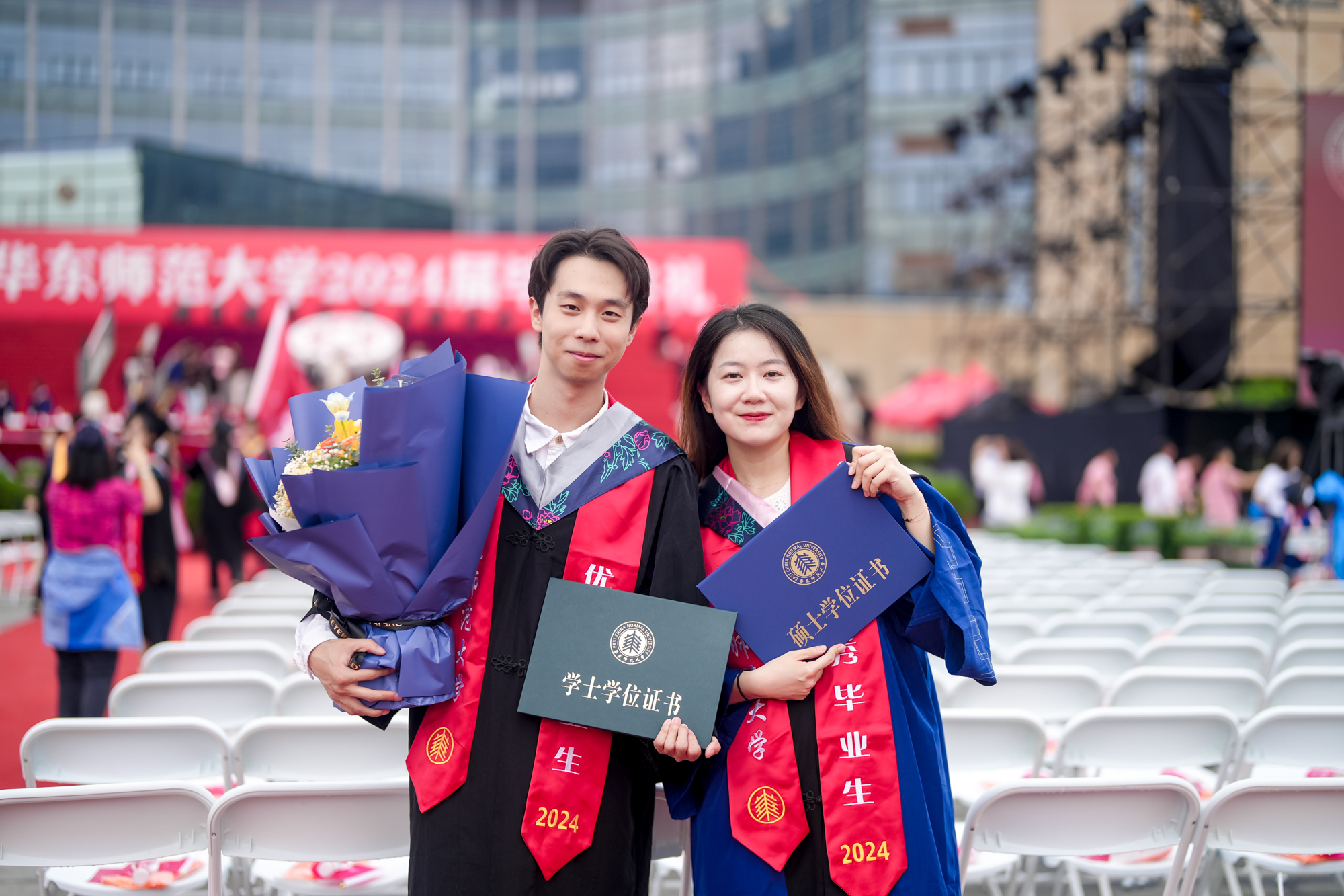 毕业典礼由国家高层次青年人才、君浩青年科学家奖获得者、精密光谱科学与技术国家重点实验室教授袁翔和传播学院2024届研究生周雨洁主持