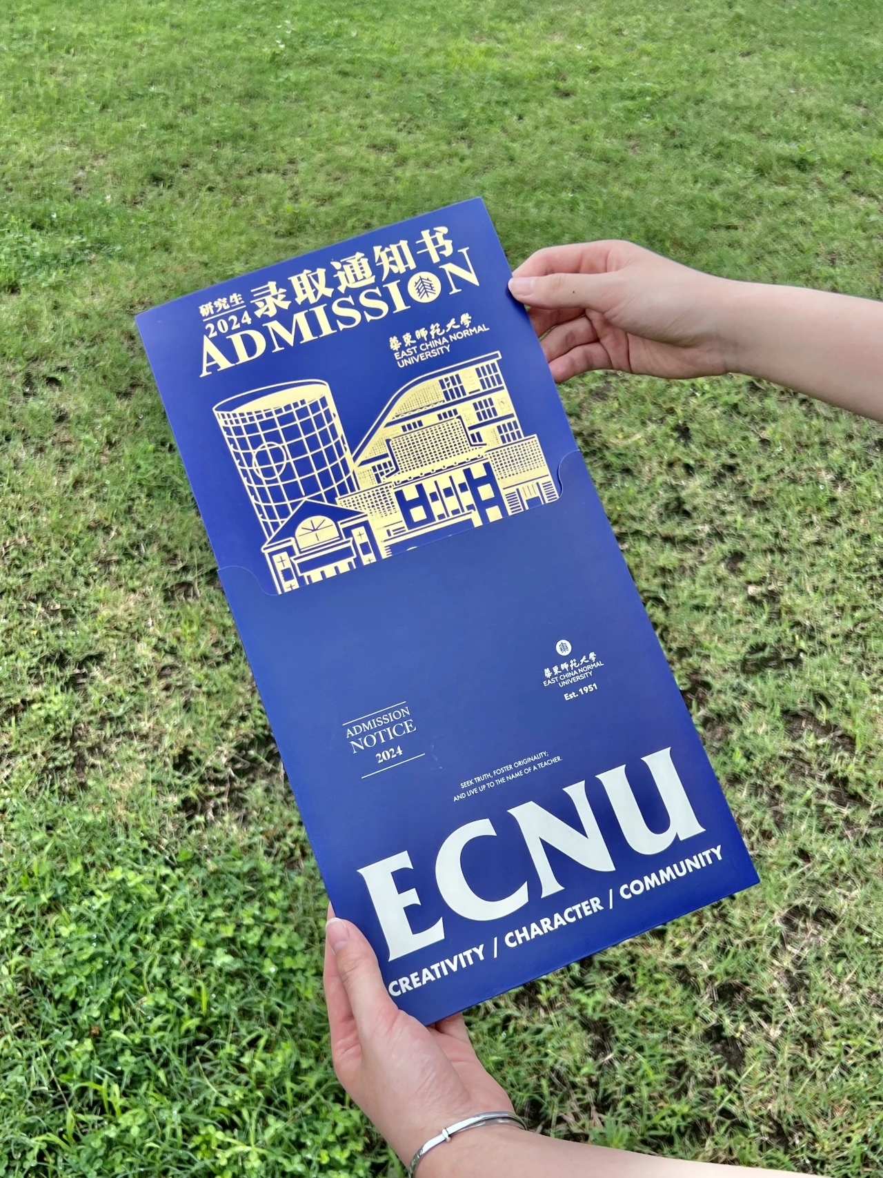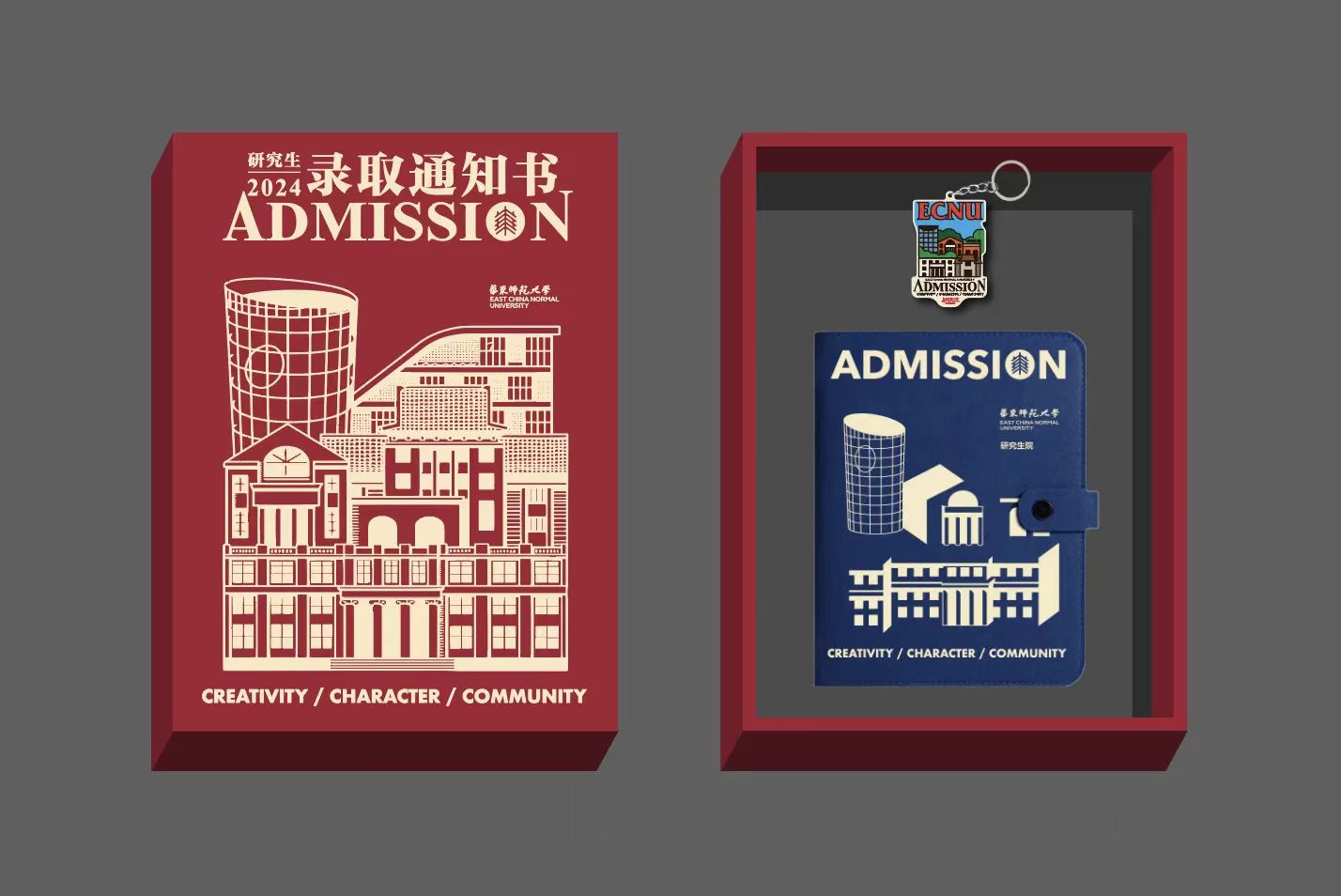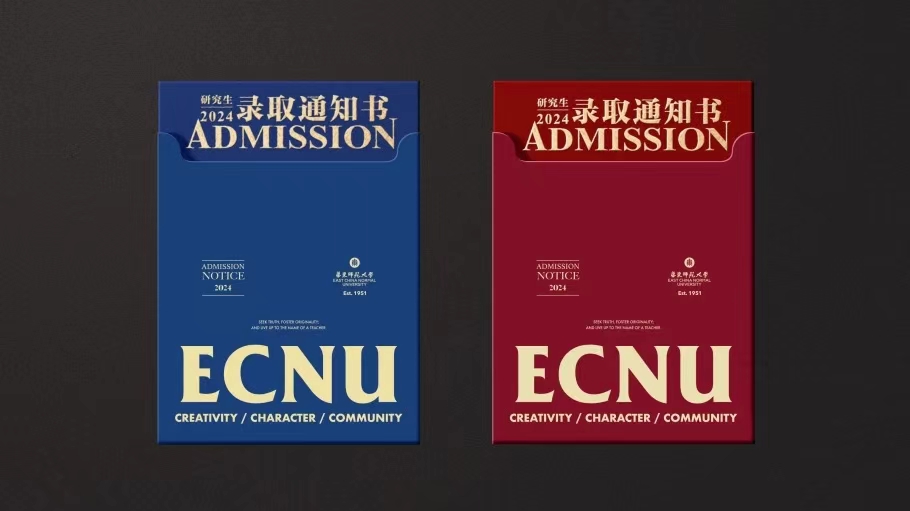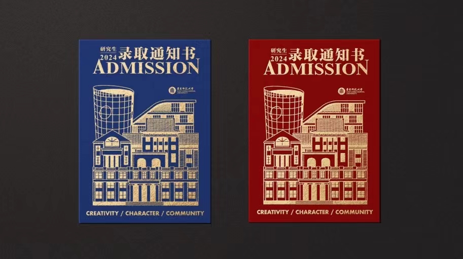 2024录取通知书全新加装了函套,ECNU置于中(心)心(中),上、下分别印有校训及孟宪承老校长提出的大学理想。顶部异形开口与内页形成视觉整体,更将录取的仪式感汇集到从函套中抽出通知书的那一刻!