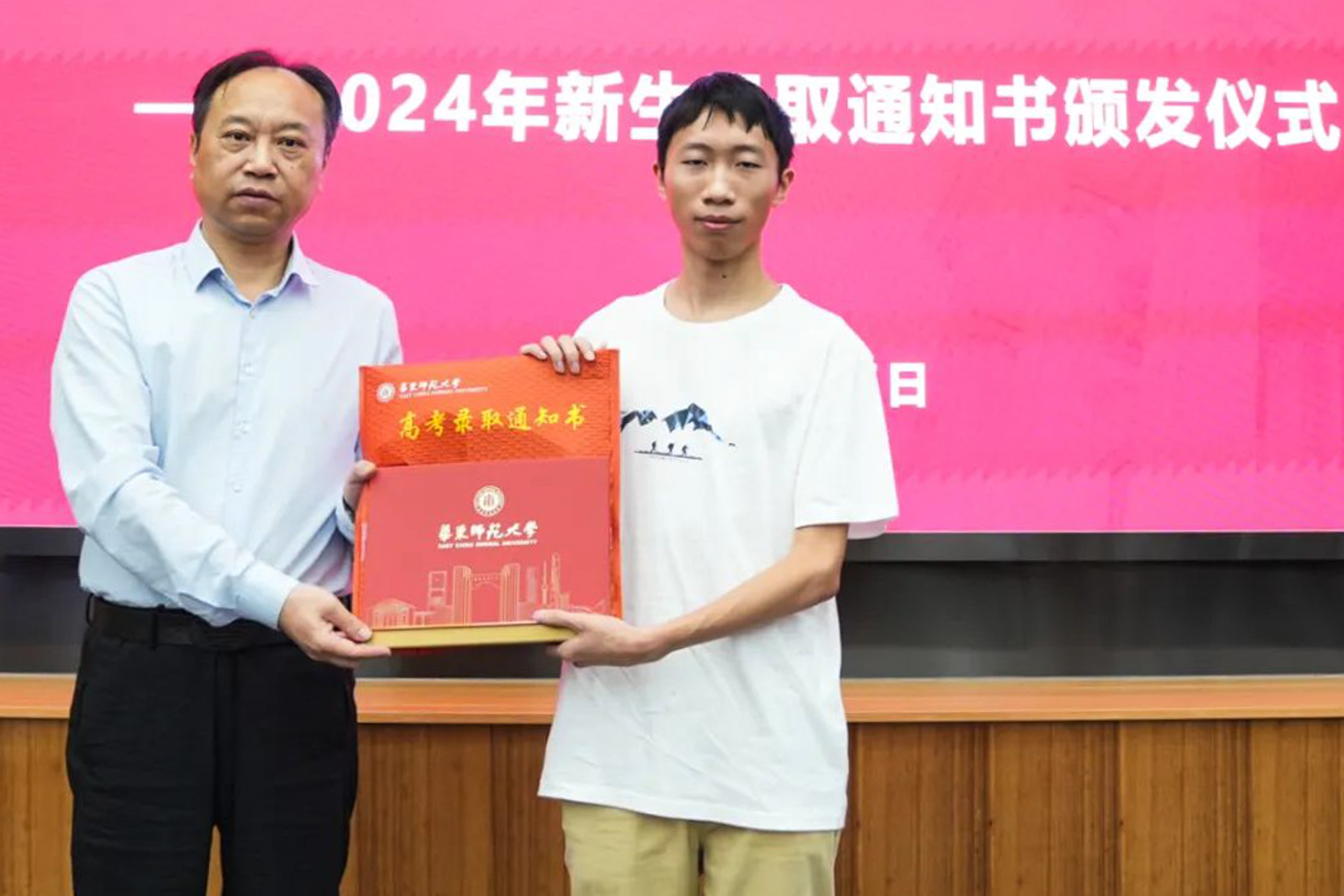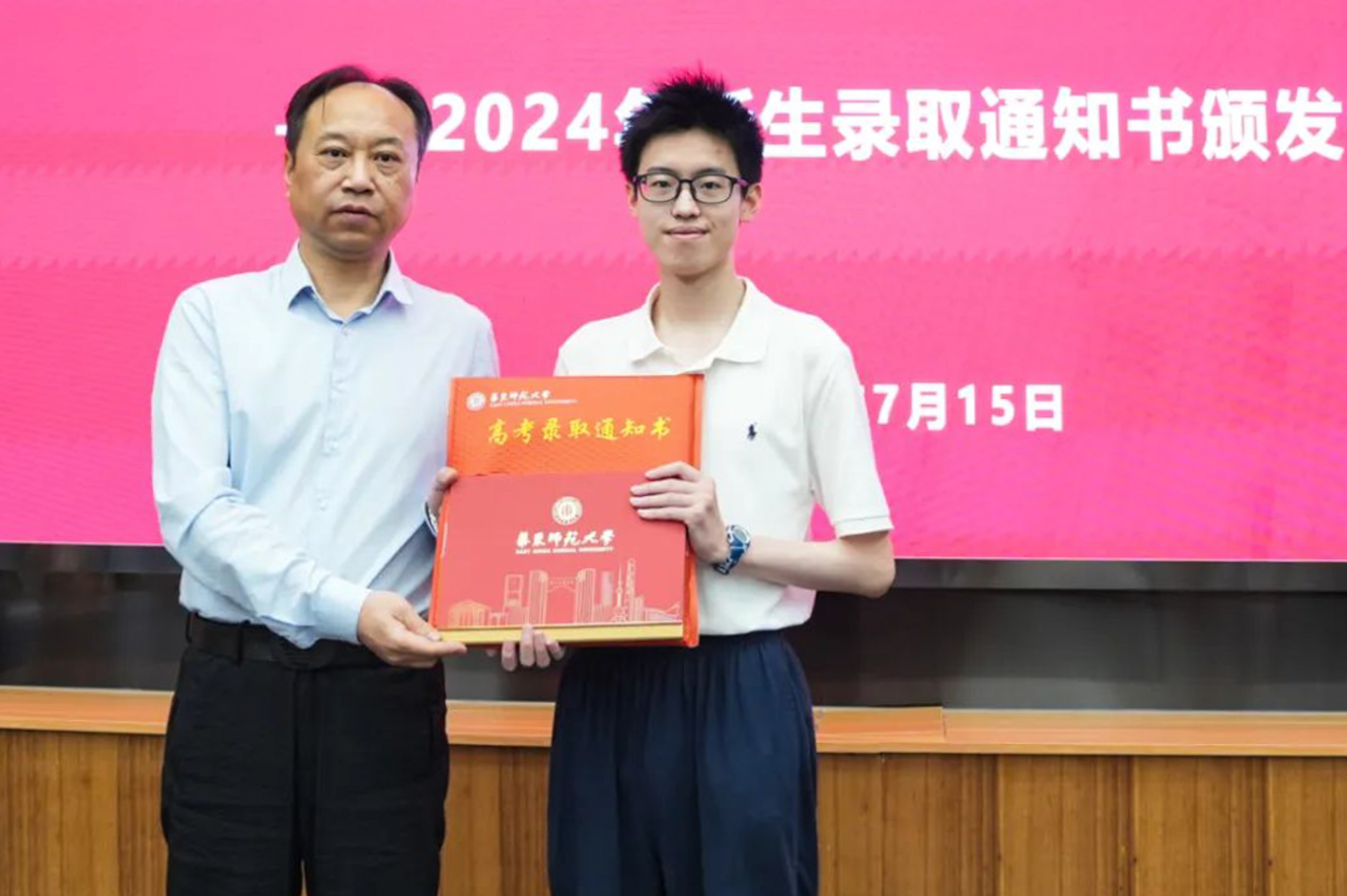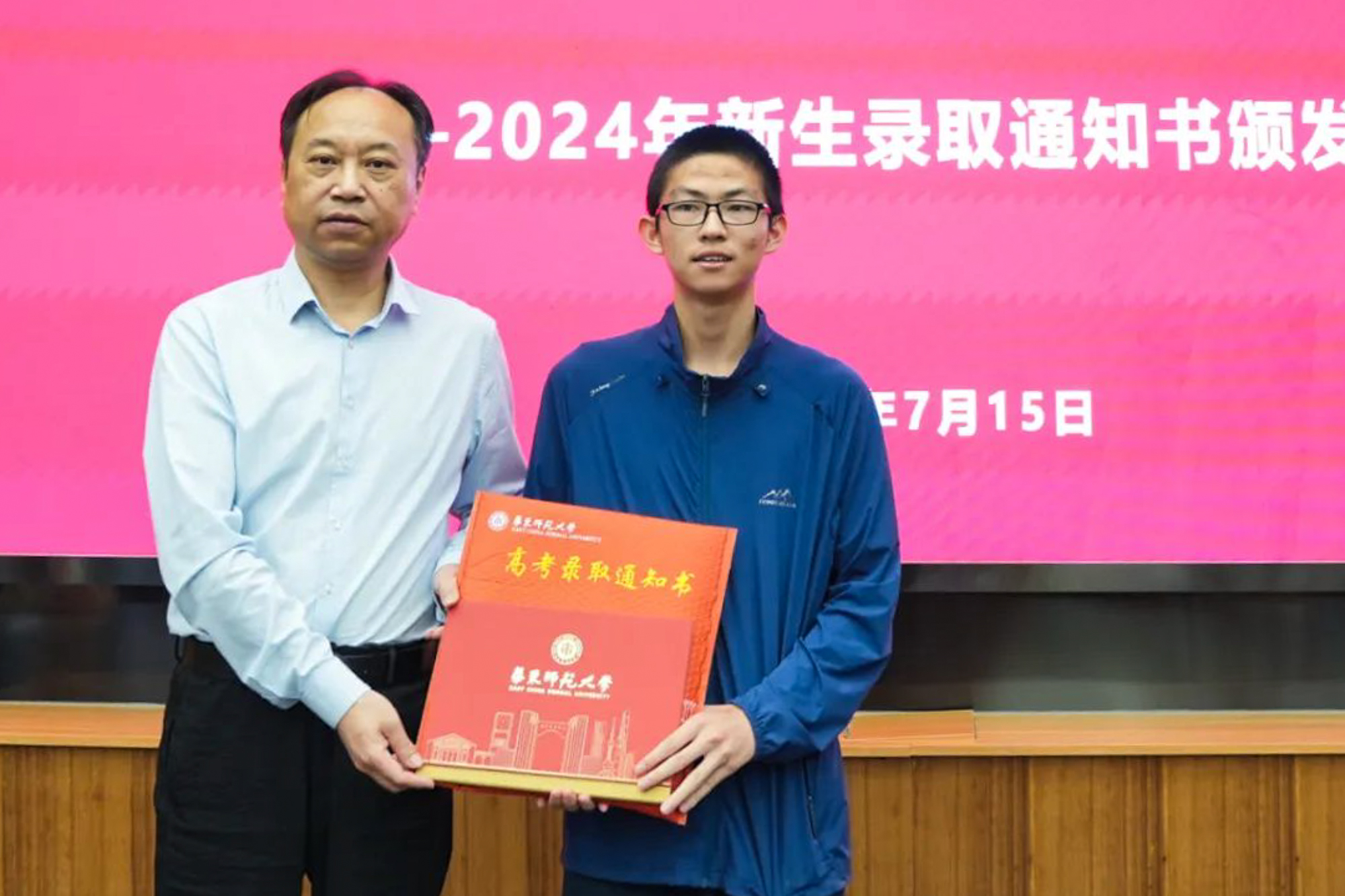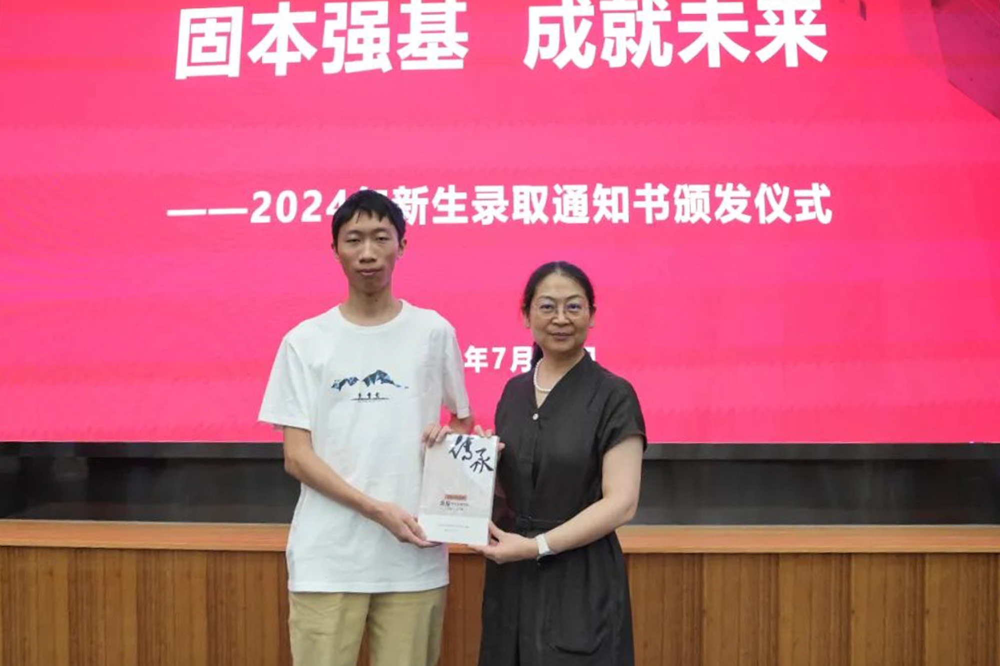 副校长戴立益为0001、0002、0003号录取通知书获得者颁发通知书