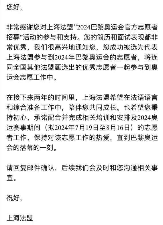 约两周后,我获得了法国驻华大使馆的2024巴黎奥运会志愿者offer,成为代表驻上海总领事馆的两位志愿者之一,将担任国家奥运委员会助理(Assistant Comité National Olympique)。