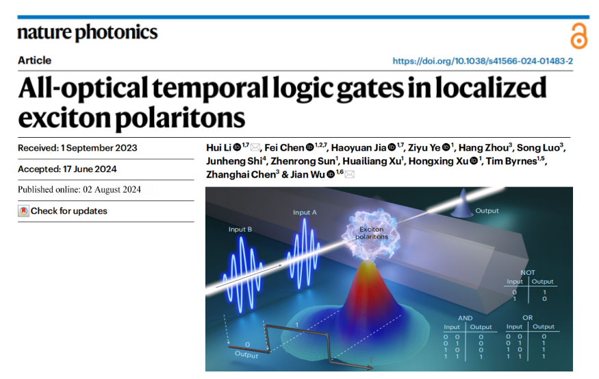 2024年8月2日,永利皇宫登录官网精密光谱科学与技术国家重点实验室吴健教授科研团队成果在国际顶级期刊《自然光子学》(Nature Photonics)杂志在线刊发。该团队首次在室温激子极化激元体系中实现了时域“与”“或”“非”逻辑门功能,为大规模超高速逻辑运算器件的发展奠定了关键基础。