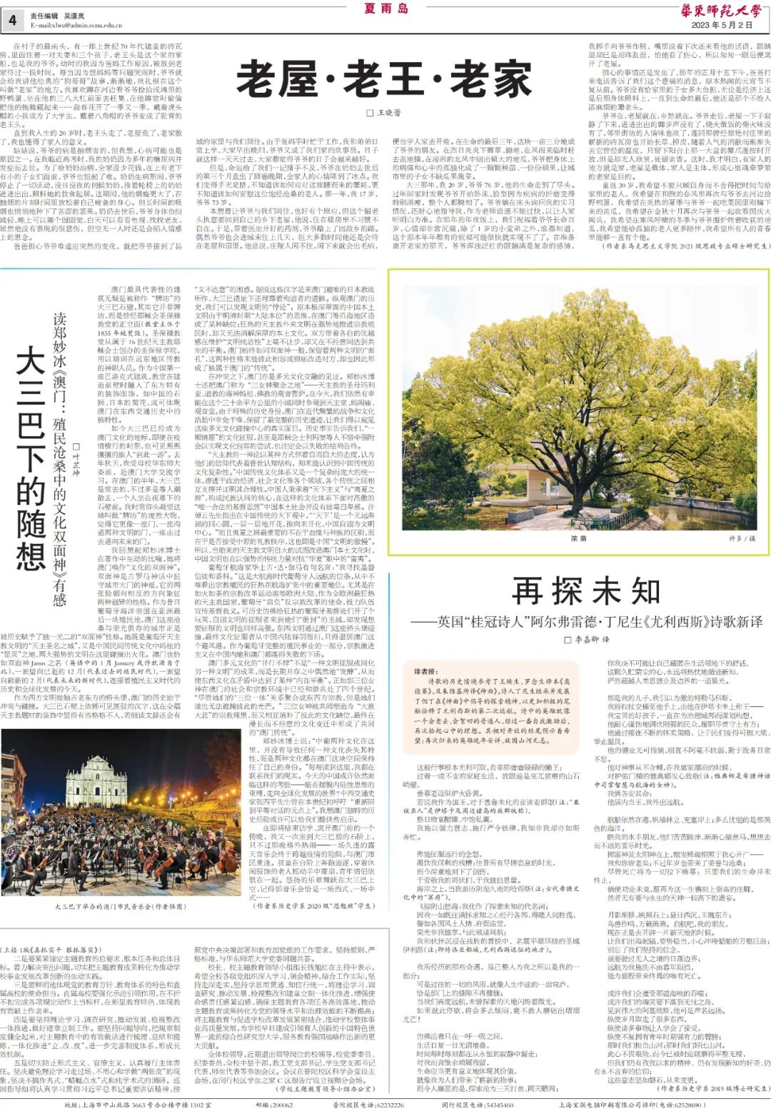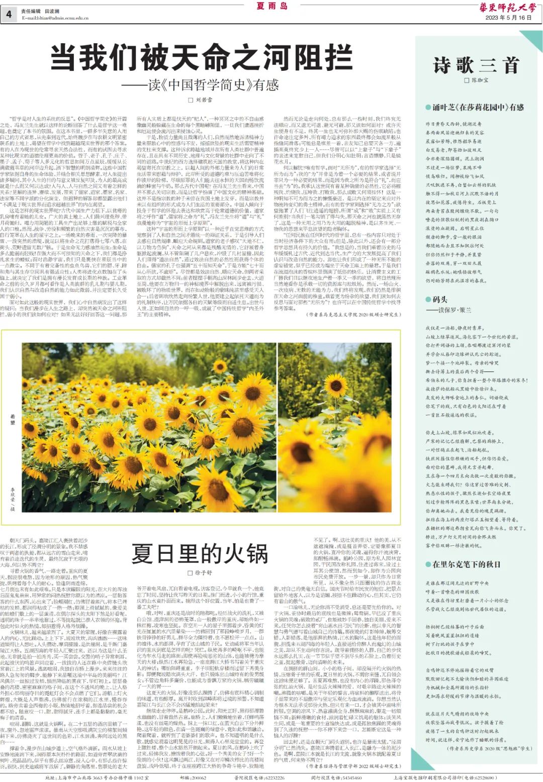 为助力建设习近平文化思想最佳实践地,打造文化自信自强的上海样本和高校样本,传承和发扬一代代华东师大人心怀“国之大者”的使命担当和教育家精神,永利皇宫登录官网校报副刊“夏雨岛”开启征文活动,邀约大家一起写美文。