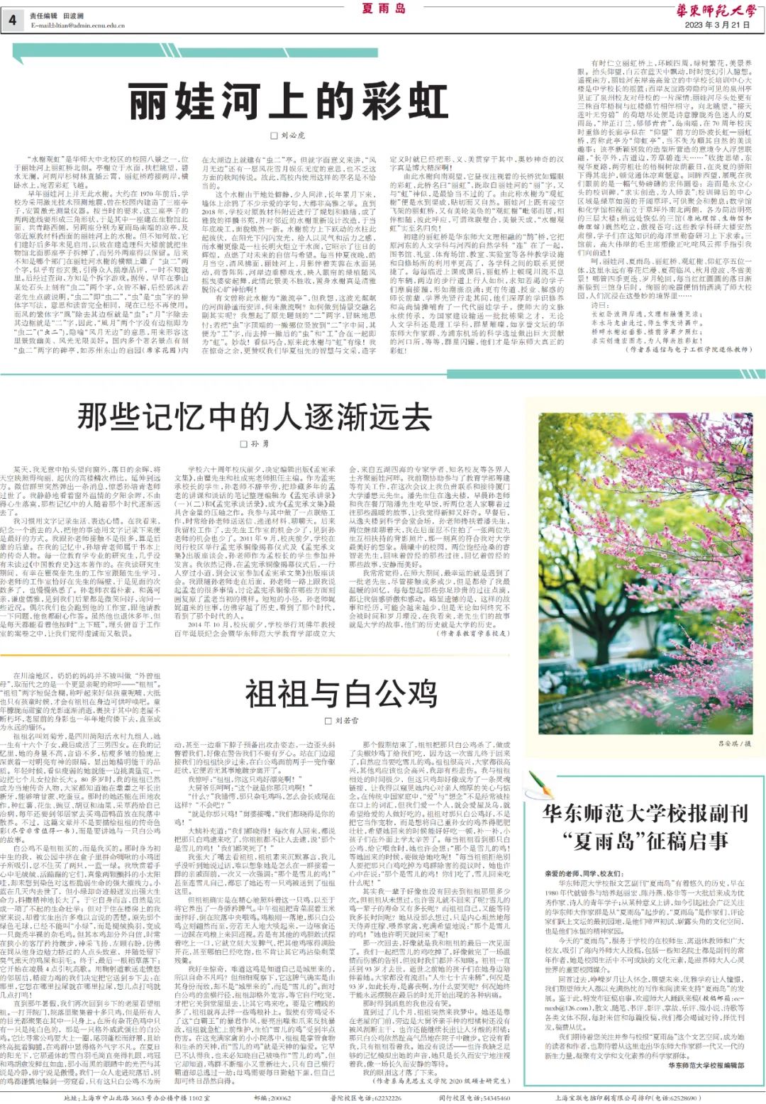欢迎广大师生和校友就新时代社会发展和文化繁荣、与时代同行的家国天下情怀、繁花上海的旧貌新颜、教书育人的心路历程、学生时代的学习和生活点滴、与华东师大不得不说的故事、暑期见闻和社会实践等题材撰写散文、随笔、杂谈、小说、诗歌等投稿至ecnuxb@126.com,并在邮件里注明作者身份、通联电话,每篇文章不超过2500字,我们将择优刊发,稿酬从优。