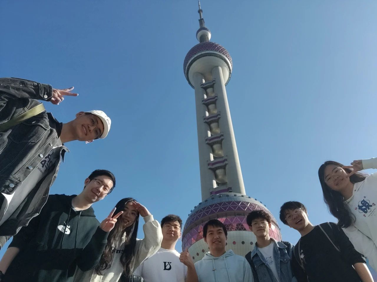 王玮烽(右四)和同学们在东方明珠塔下合影