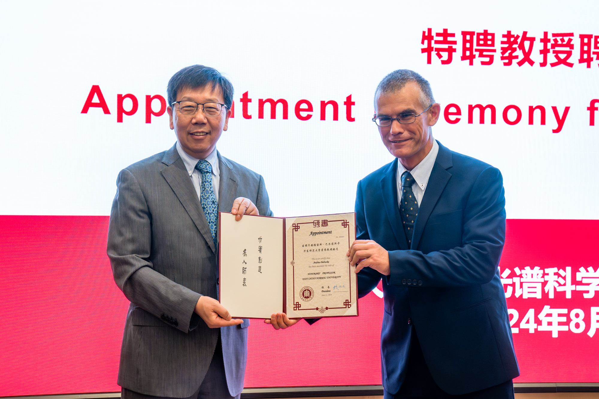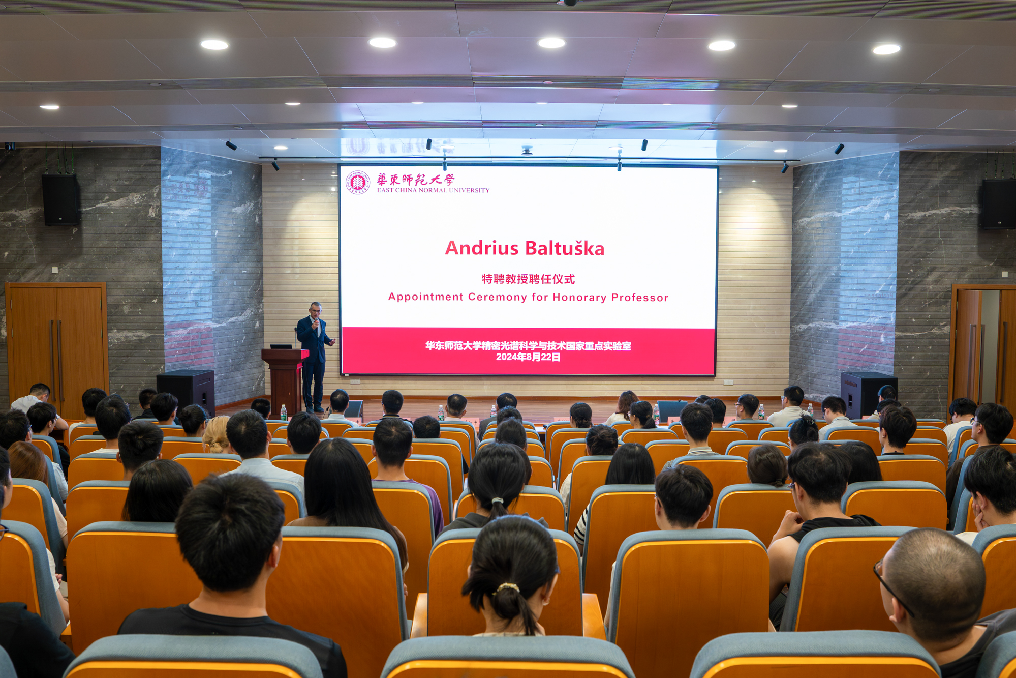 校长钱旭红院士为Andrius Baltuška院士颁发了荣誉教授证书。精密光谱科学与技术国家重点实验室副主任李文雪在致辞中高度评价了Andrius Baltuška院士在超强超快激光技术方面的卓越贡献。