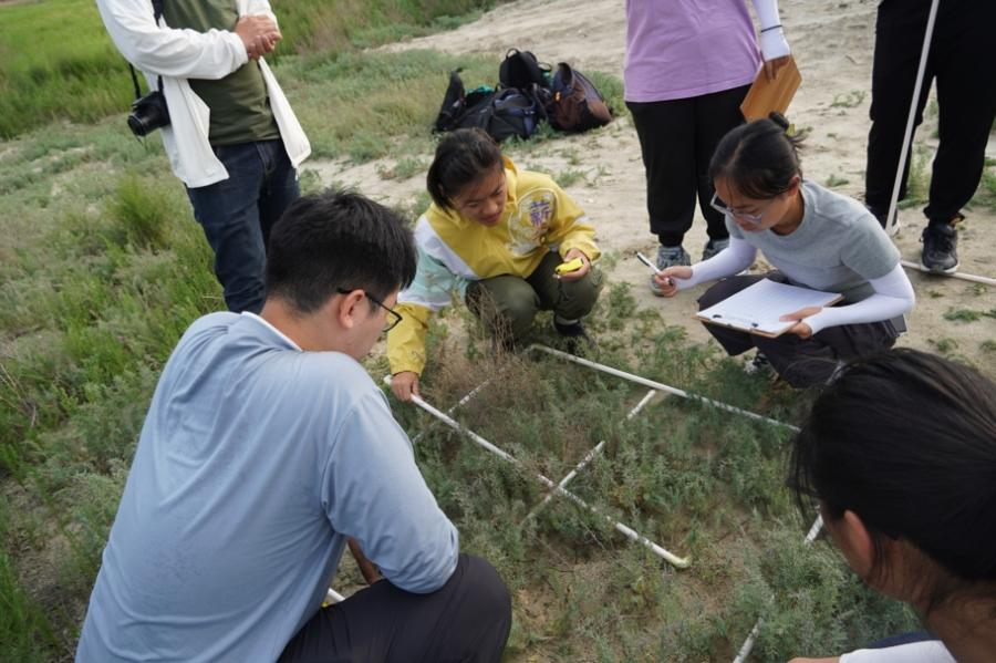 转战宁夏中卫,沙坡头野外站内一片片防风固沙试验田是无数研究者对抗风沙的坚韧宣言,漫天黄沙中素未谋面的沙生植物展现着生命的顽强。吴忠水稻田里,学生们穿梭其间采样的同时,也领略着“天下黄河富宁夏”的丰富水资源,灌溉出西北干旱中的一抹翠绿与生机。内蒙古腾格里的广袤沙漠中,师生们在进行沙生植物样方调查时,偶遇荒漠麻蜥穿梭于沙冬青群落间,一场意外的“科学追逐”,让本站课程变得更加刺激。