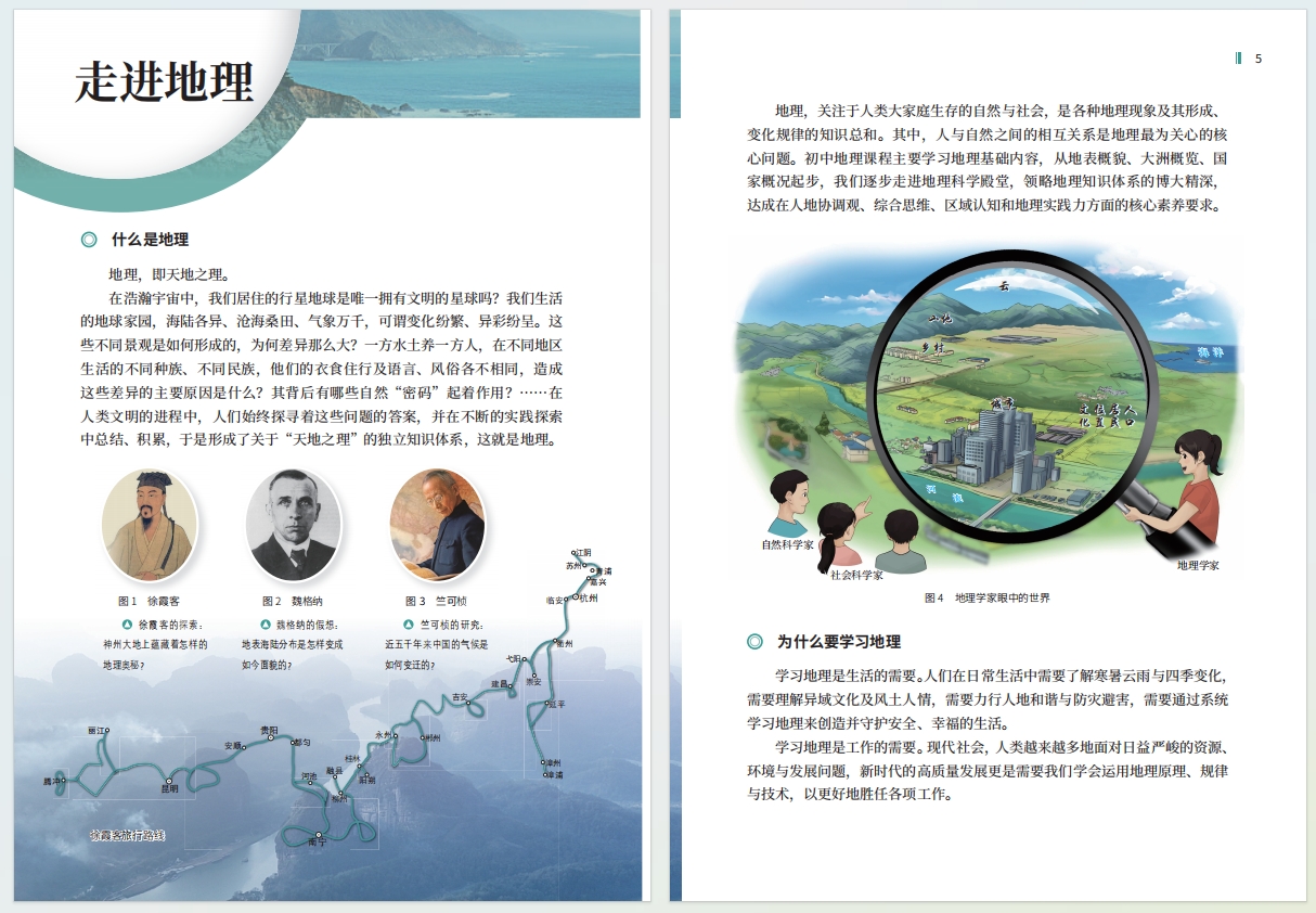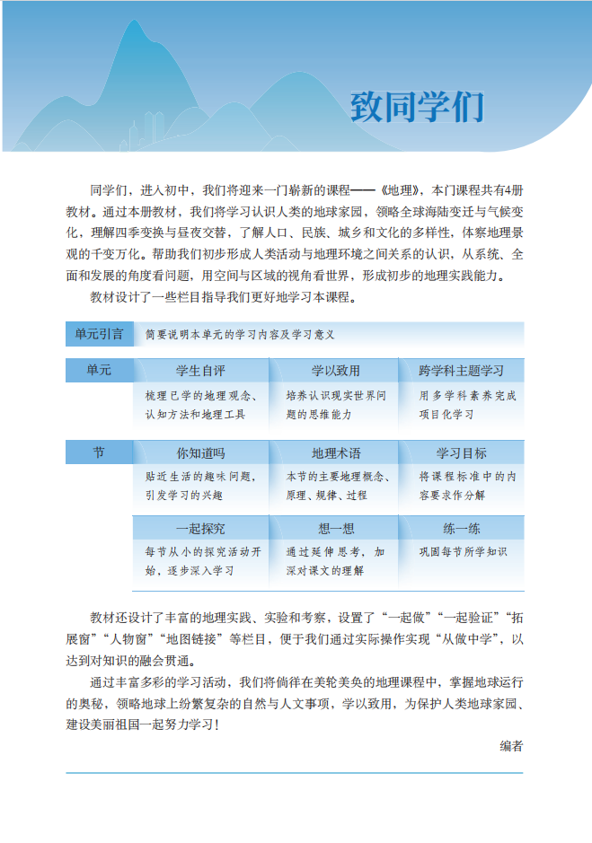 义务教育地理课程内容应贴近生活,关注自然与社会,具有生活性、实践性和综合性等性质。本套教材创新编排体系,在搭建架构教材时,采用“真实世界问题驱动式”架构。