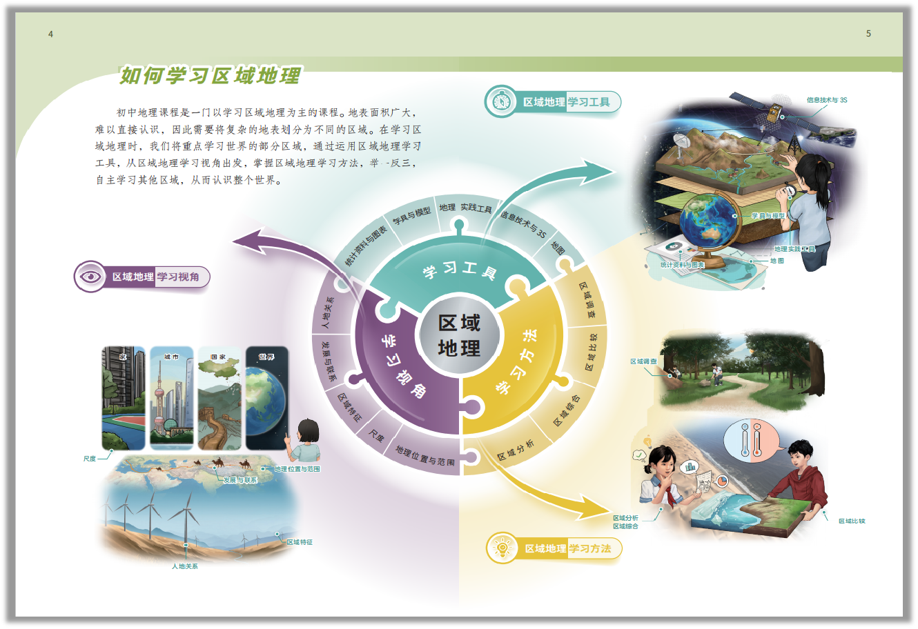 本套教材从地理学科本体知识出发,横向联系其他学科相关知识、原理等,借鉴STEAM教育等学习理念设计跨学科学习主题,体现知识的综合性与现实问题的复杂性,培养学生整合各个学科知识解决现实世界复杂问题的能力。