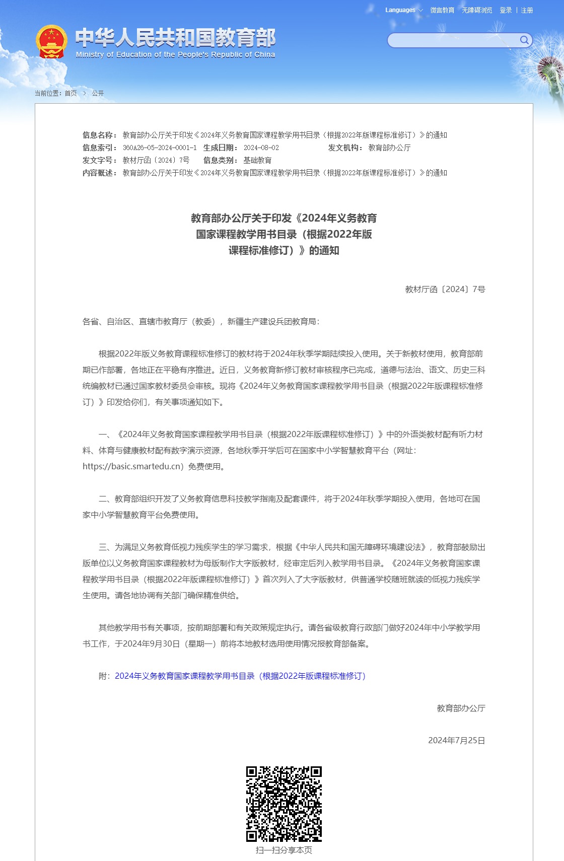 教育部下发关于全国义务教育教材目录的通知