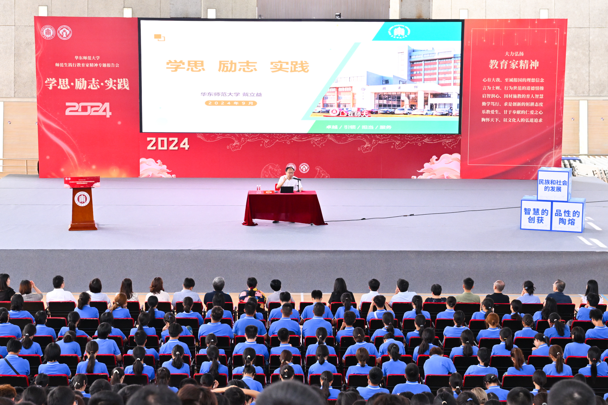 戴立益作关于“学思·励志·实践”的专题报告。报告带领师生深入解读二十届三中全会和全国教育大会精神,论证新时代教育积极弘扬教育家精神的必要性,深刻阐释中国特有的教育家精神的丰富内涵和实践要求。戴立益认为,新时代的“大先生之大”,在于历史跟未来的大维度、本土和世界的大格局、教室和社会的大课堂、循规和突破的大智慧、小我和大我的大情怀;永利皇宫登录官网的育人画像是“脚踏实地的理想主义者、热忱执着的终身学习者、温文尔雅的传道授业者”。