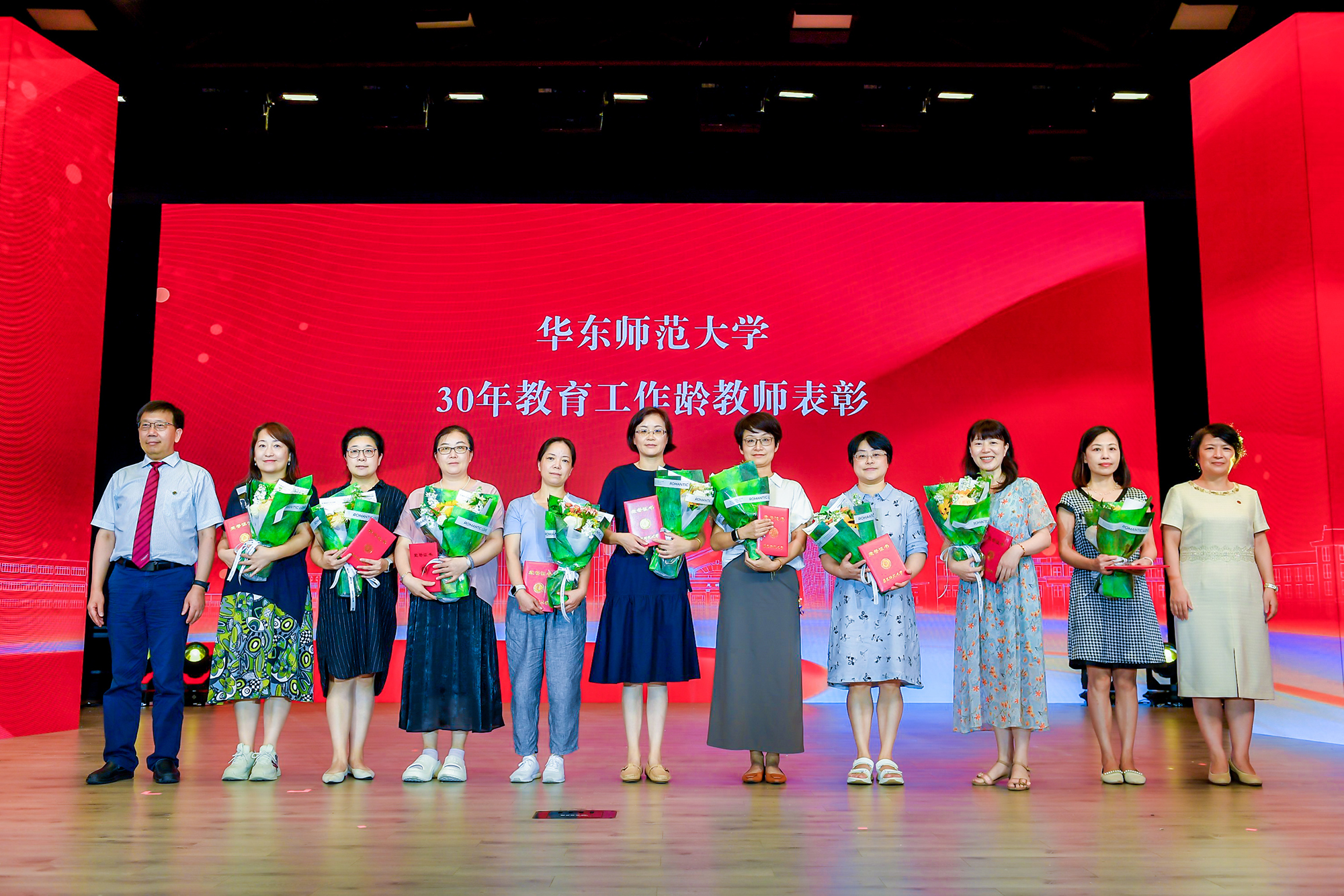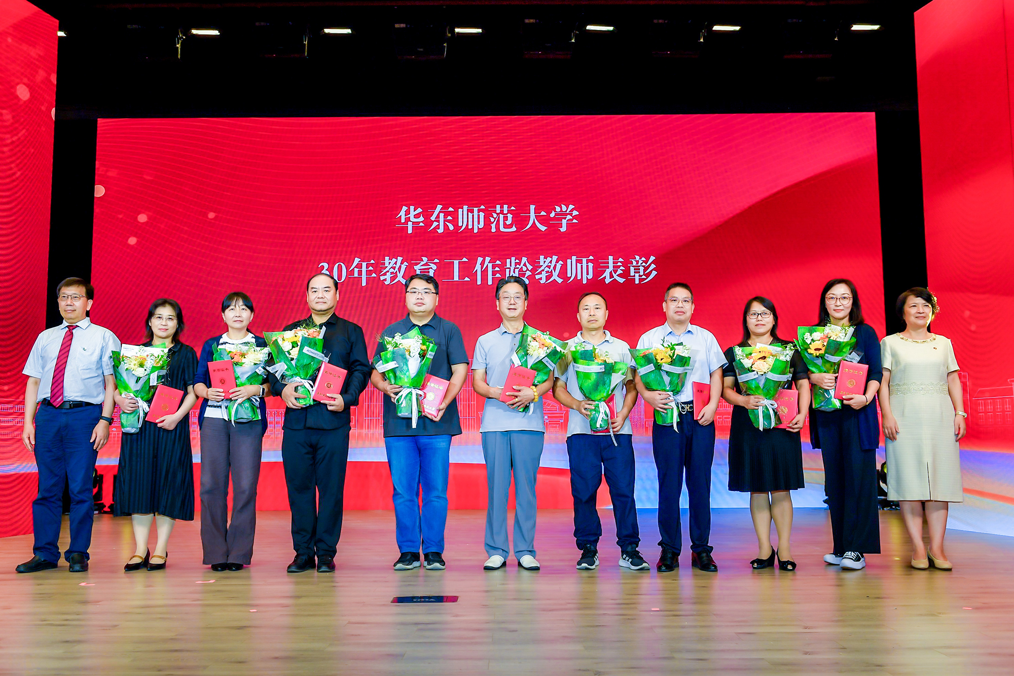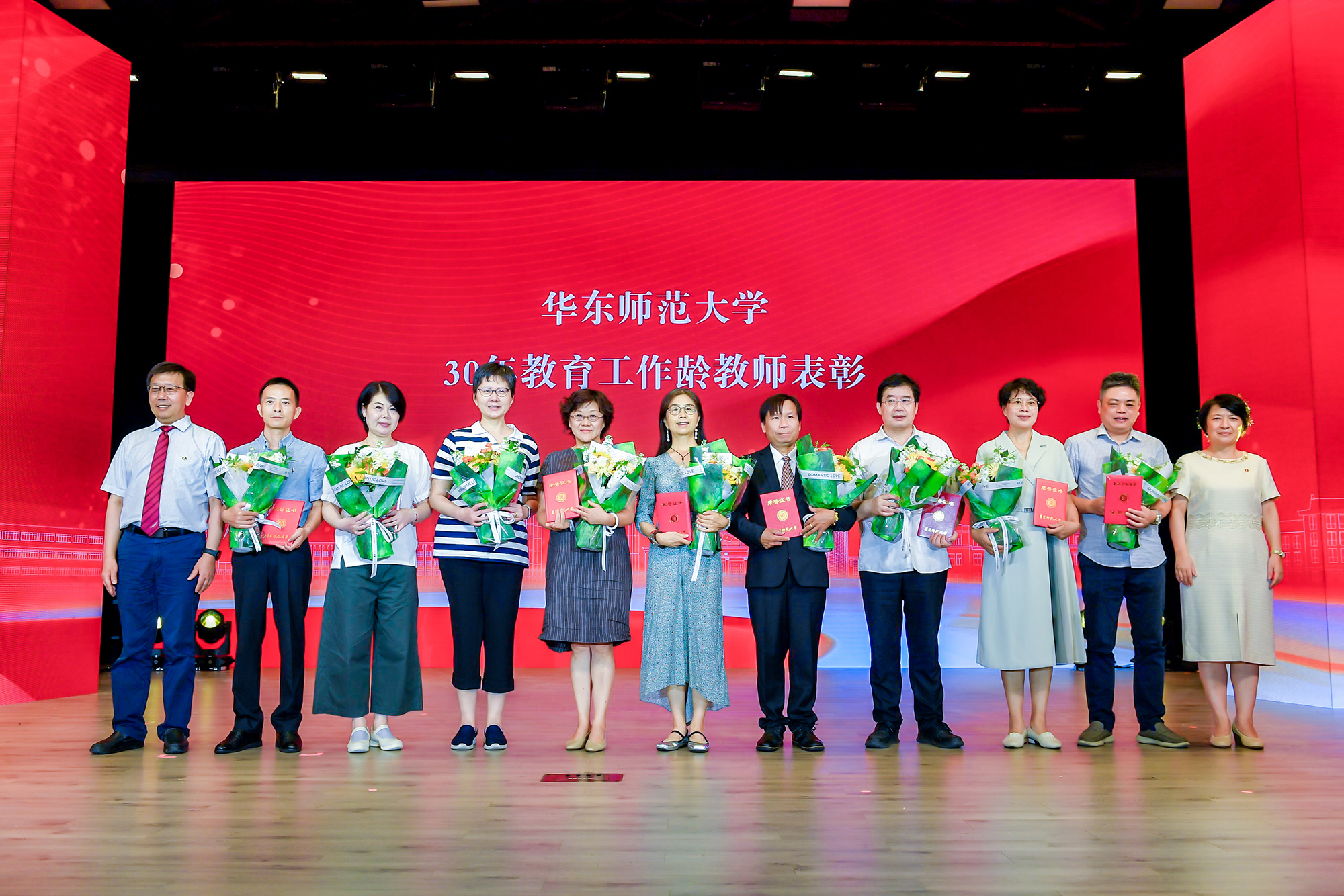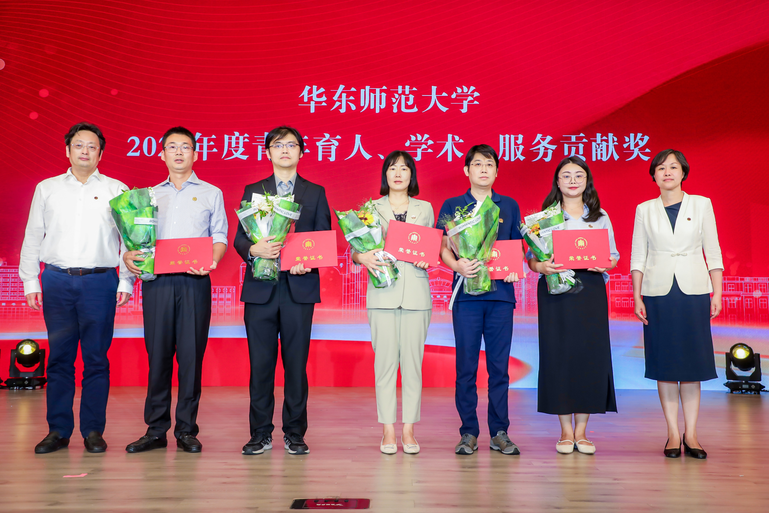 在热烈的掌声中,校领导梅兵、钱旭红、曹友谊、孟钟捷、戴立益、施国跃、程静,分别为学校2023年度育人贡献奖、学术贡献奖、服务贡献奖获得者,第十四届师德标兵荣誉称号获得者,满30年教育工作龄的教师颁发证书,今年新入职的教师代表向受表彰的教师献花致敬。