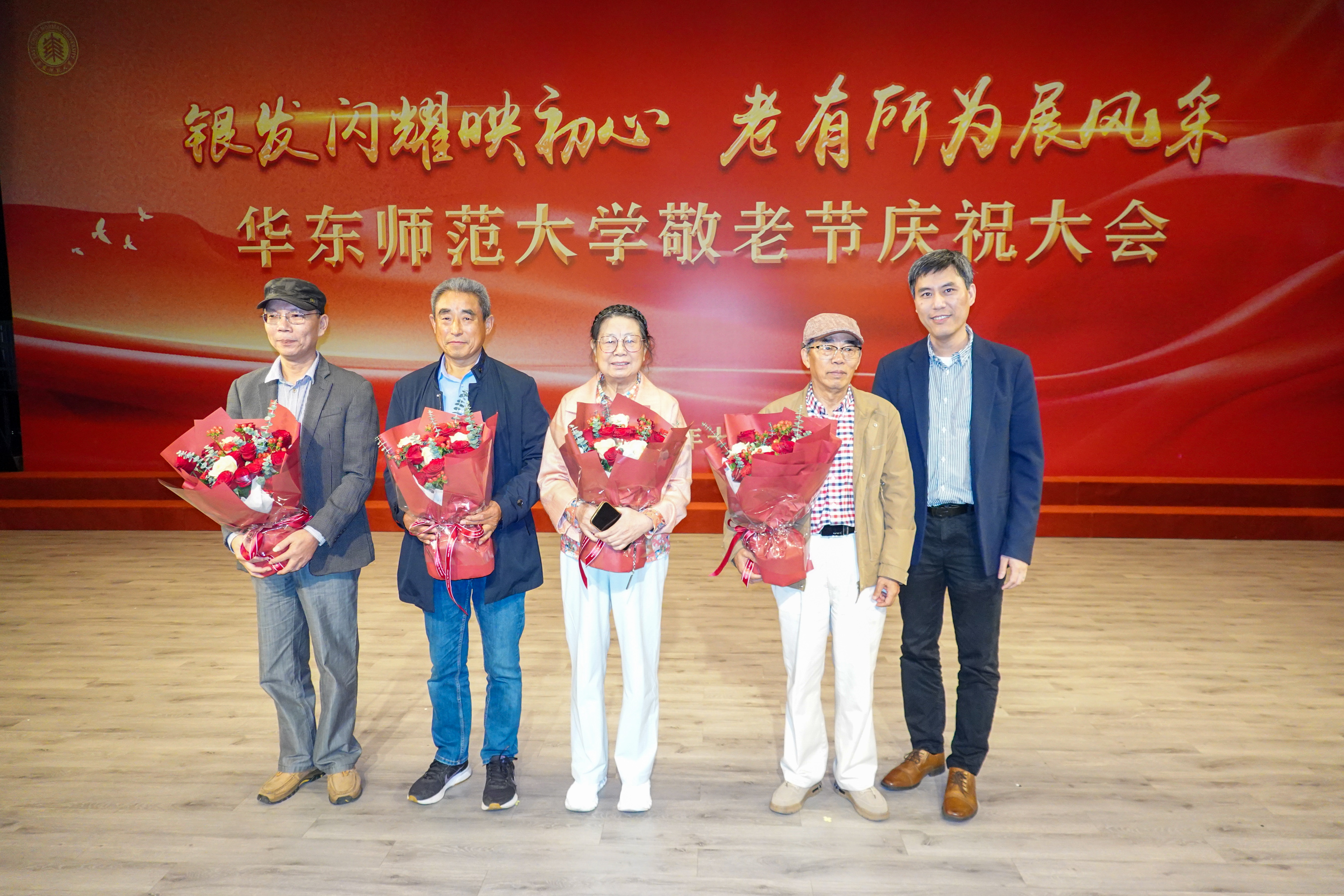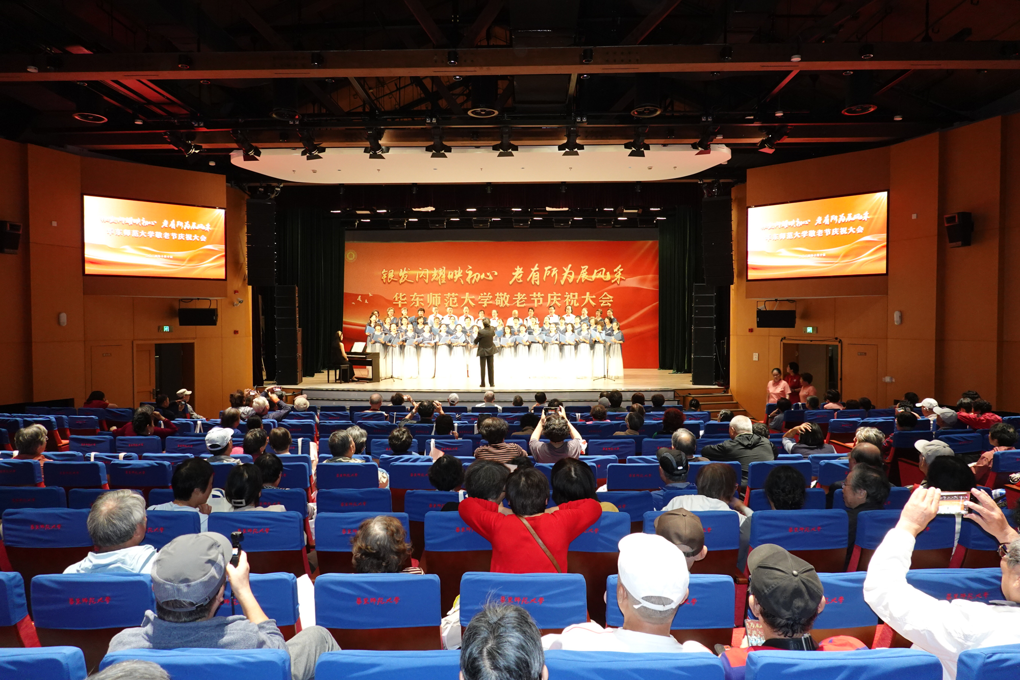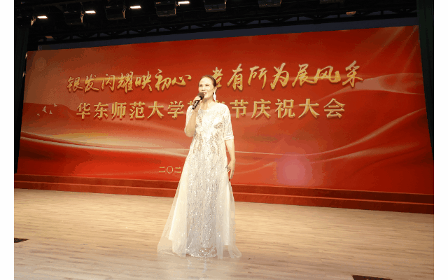 庆祝大会上,全校离退休及师生文艺团体为敬老节倾情献演,文艺汇演由华东师大老年艺术团团长李小英老师主持。老年艺术团舞蹈队、朗诵队、合唱队,老年大学越剧班、时装表演班,教工太极拳协会,学生艺术团,体健学院健美操队,附属小学舞蹈队等团体,为现场及线上观看的离退休教职工献上精彩的文艺演出。