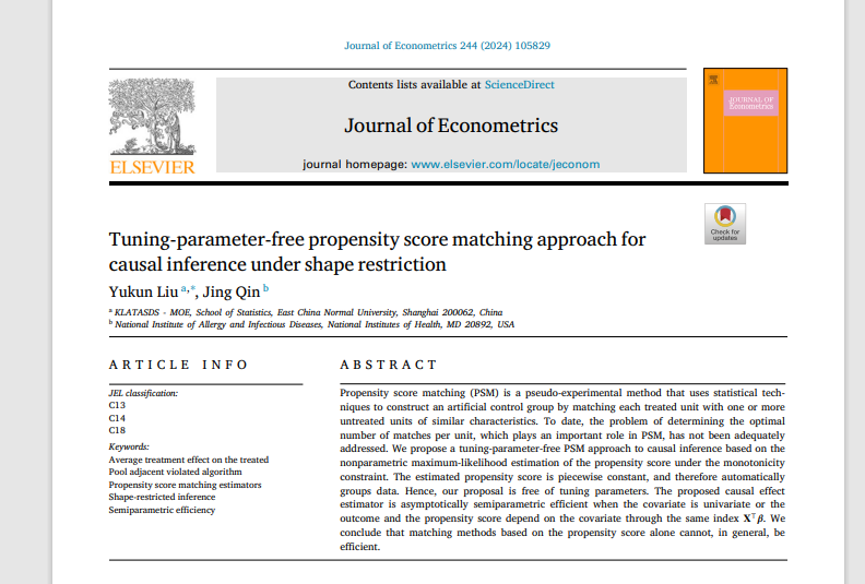相关成果以Tuning-parameter-free propensity score matching approach for causal inference under shape restriction为题,发表在计量经济顶级期刊Journal of Econometrics。
