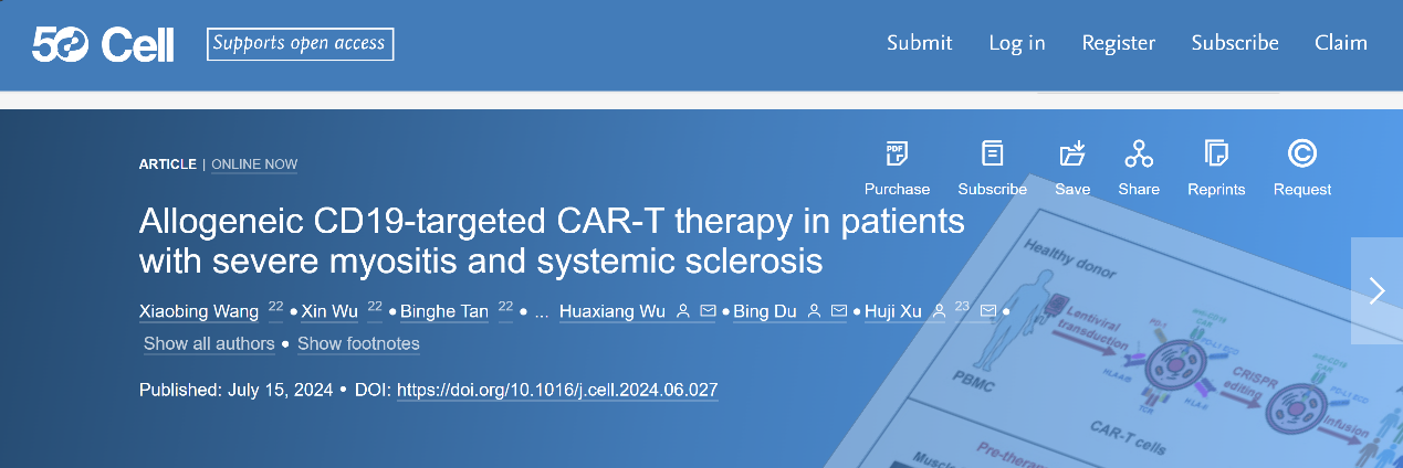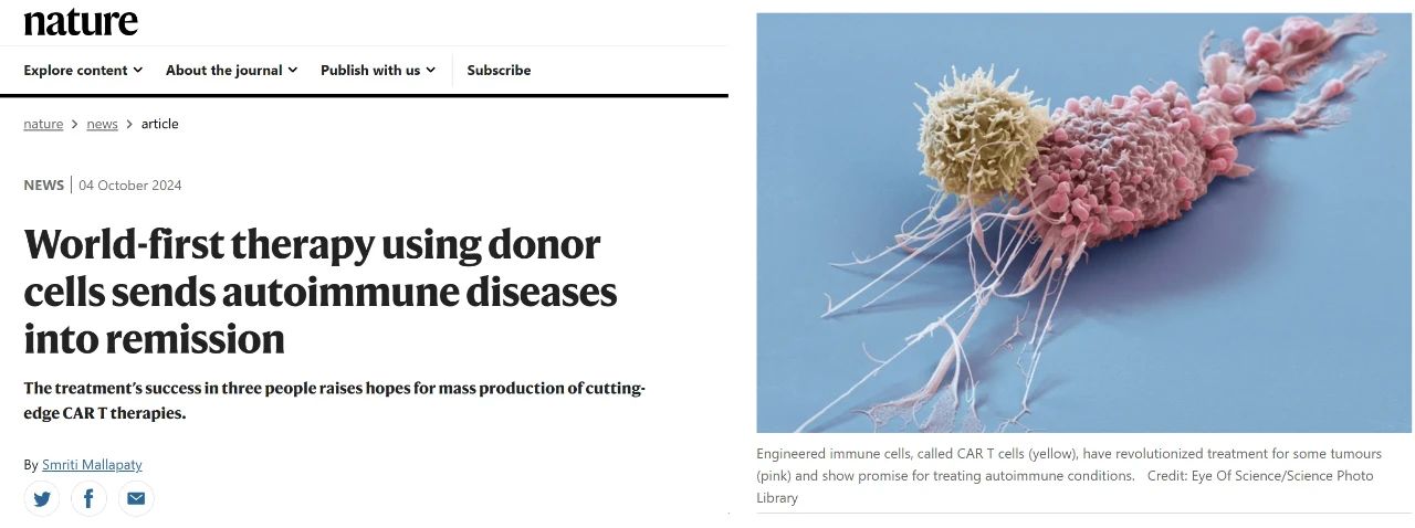 2024年10月4日,Nature官网头条发布题为World-first therapy using donor cells sends autoimmune diseases into remission的专题报道,认为:“这项研究的成功点燃了CAR-T细胞治疗批量化生产的希望”。