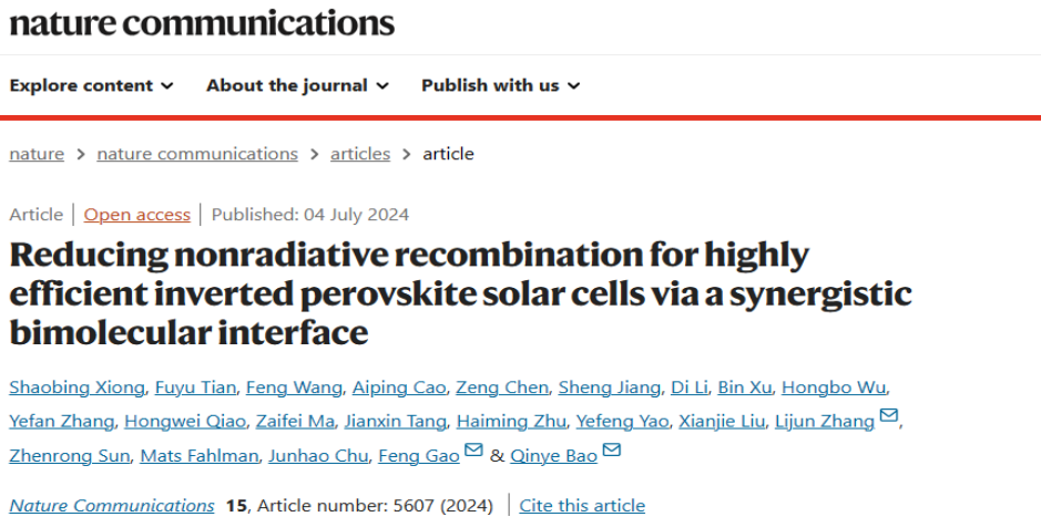 如何有效抑制半导体异质结非辐射复合是实现高性能光电器件的关键科学问题。针对该科学问题,物理与电子科学学院保秦烨教授课题组探索了卤化物半导体/有机半导体异质结的电子结构物性,提出了一种协同双分子(SBI)界面调控策略,构筑出具有优异载流子提取的异质结,并应用于模型器件钙钛矿光伏器件进行验证,创造了非辐射复合损失仅59 meV。该研究成果发表在Nature Communications上,并被选为Editors' Highlights,永利皇宫登录官网为论文第一完成单位,保秦烨教授为论文通讯作者。