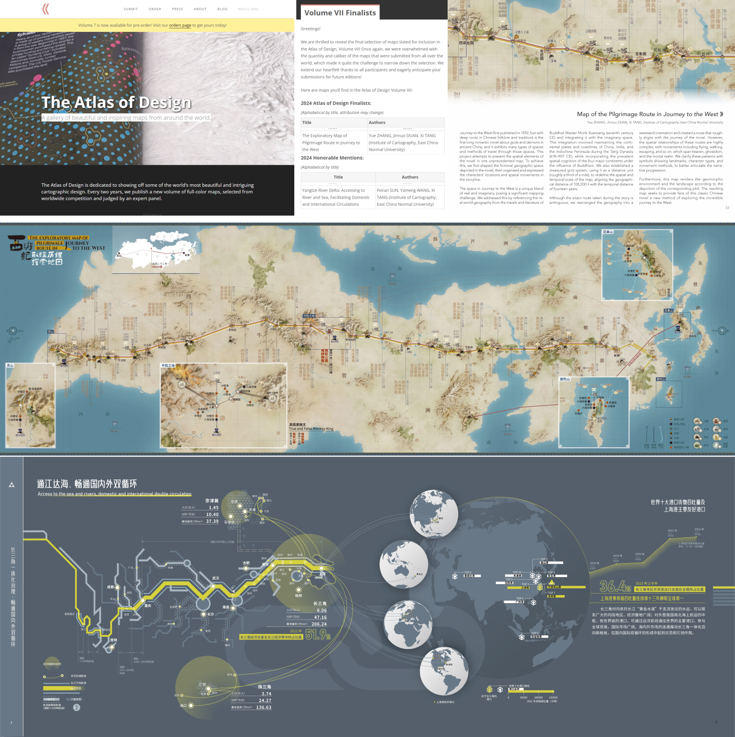 设计成果经全球竞争评审入选北美地图信息学会(NACIS)双年作品集Atlas of Design第七卷,实验室工程师张玥为第一作者。此外,实验室工程师孙斐然的另一作品《长三角:通江达海,畅通国内外双循环》入选同期Honorable Mentions名单。