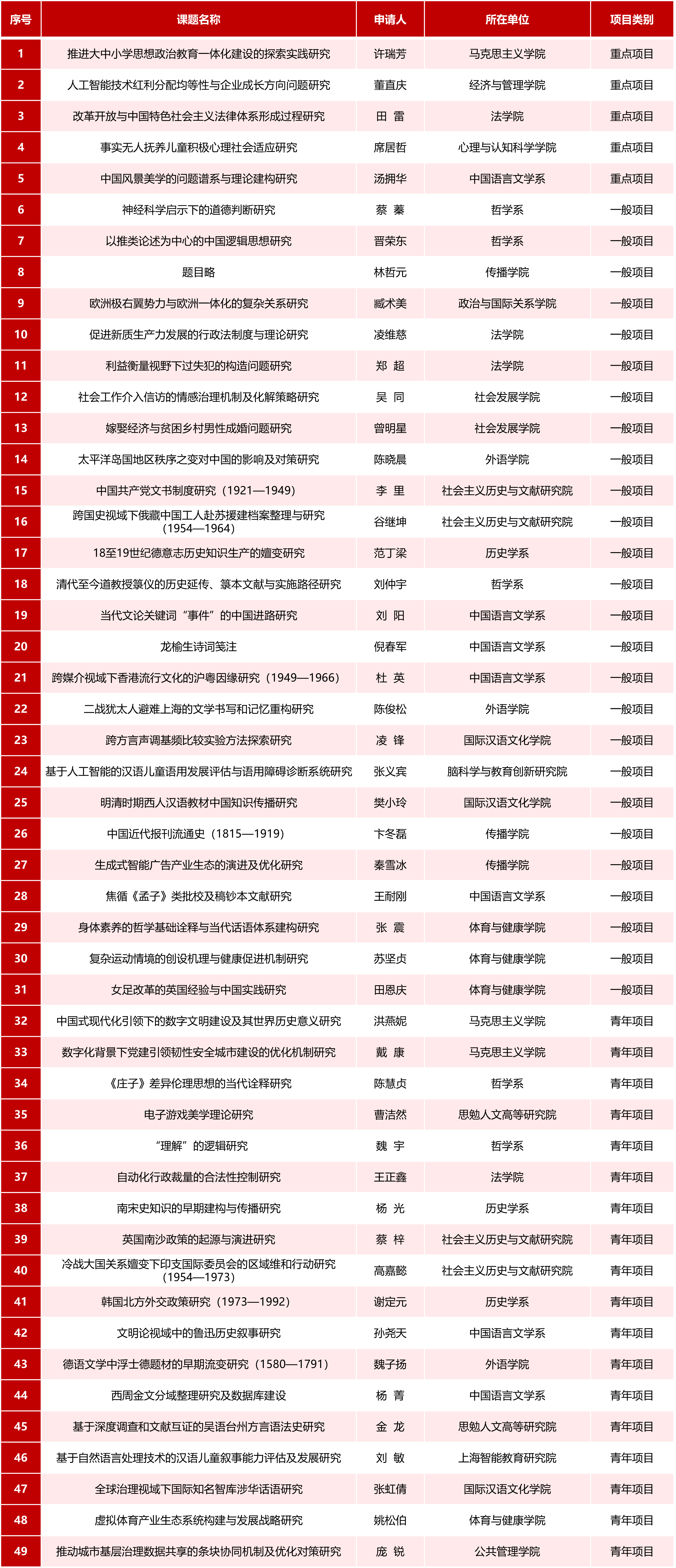 其中国家社科基金年度项目,我校中标重点项目5项,一般项目26项,青年项目18项,立项总数达49项,位居全国第7,为我校历年最佳成绩。