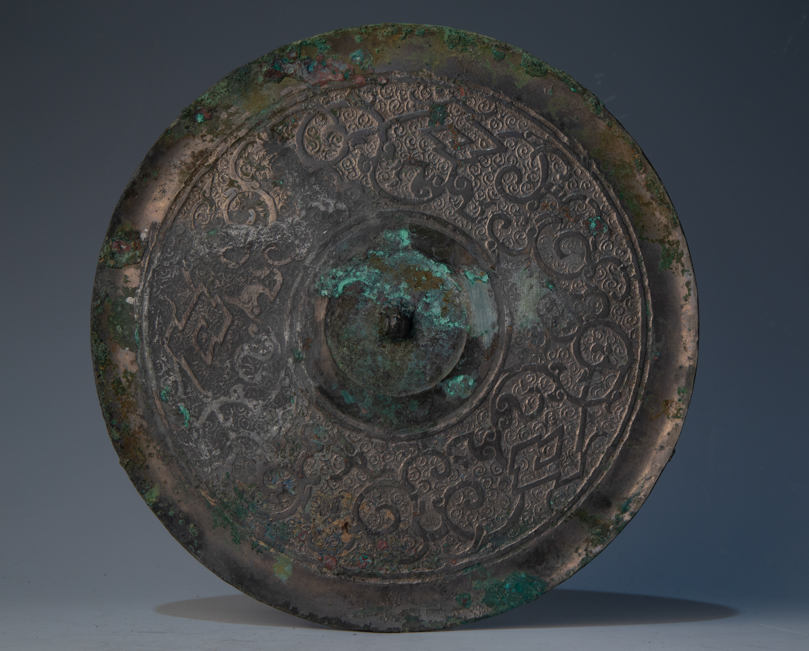 铜镜是青铜器的一大门类,早期的青铜镜也多由铜、锡、铅等金属原料铸造而成,铜镜铸造成分的差异以及数千年铜镜的保存环境的变化对其色泽产生了影响,形成了今天在铜镜上看到的“红铜”“绿锈”“孔雀蓝”“黑漆古”“水银沁”等不同的色彩。在铜镜上,常有“幽湅三商”“和以银锡青且明”等描述铜镜原料的铭文。