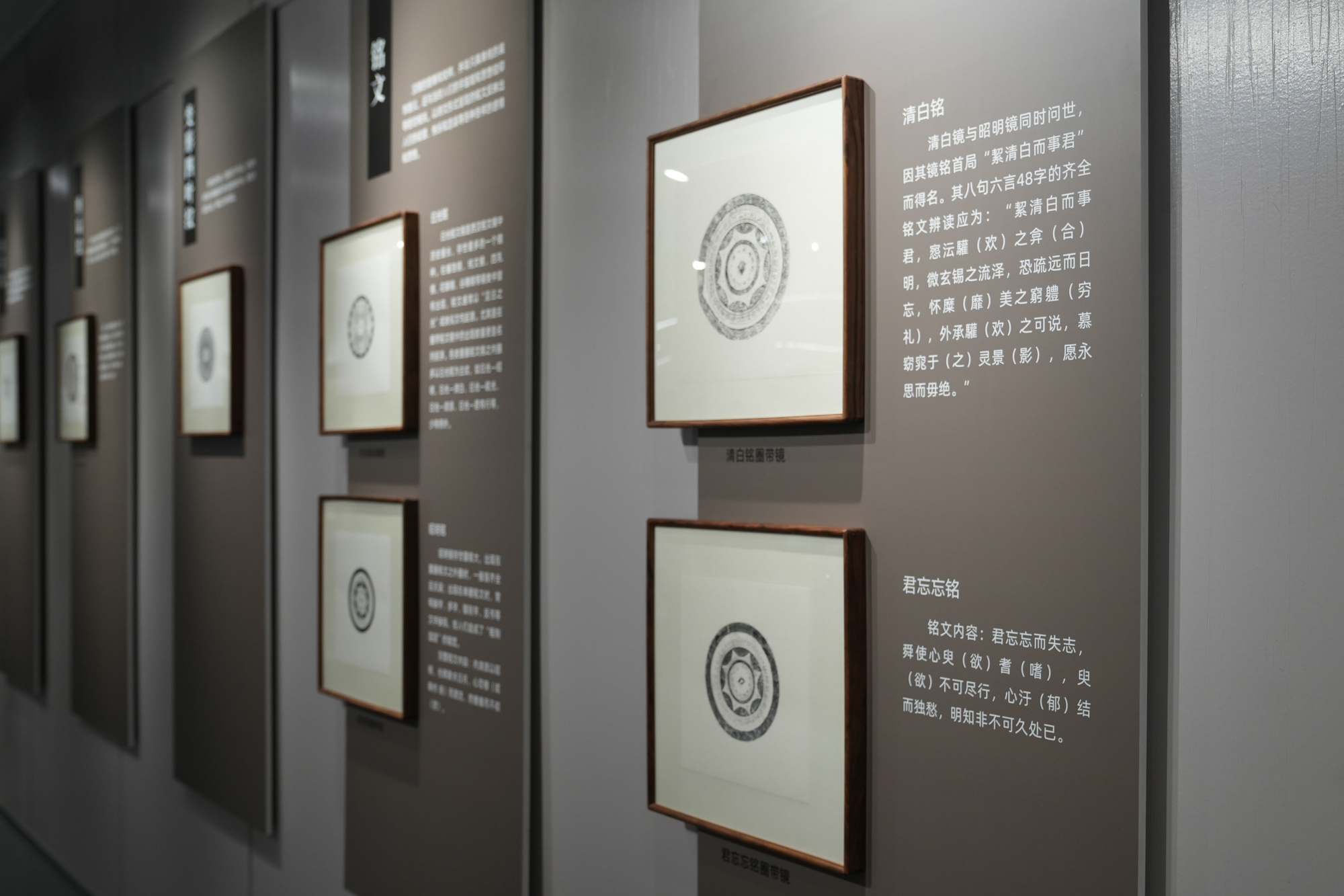 如本次展览中展出的长相思铭谷穗镜,其铭文为:长相思,毋相忘,长贵富,乐未央;又如常大乐铭谷穗镜的铭文为:常大乐贵富,得所好,千秋万岁,延年益寿。